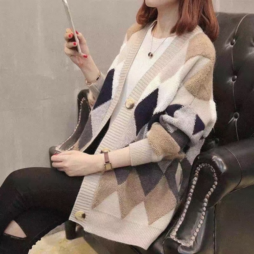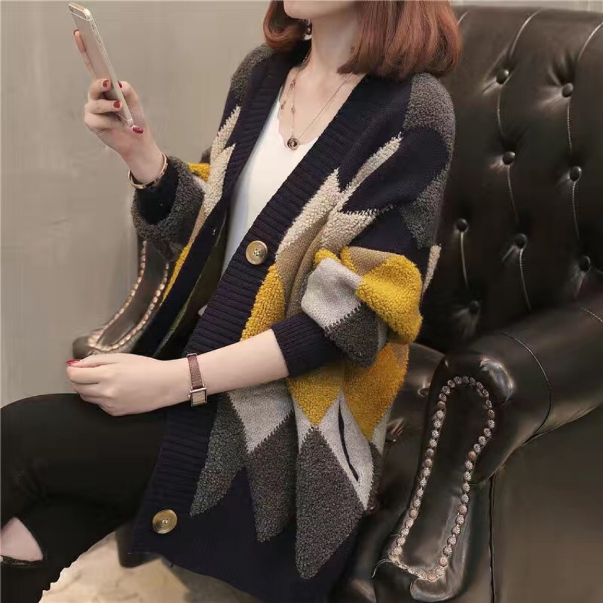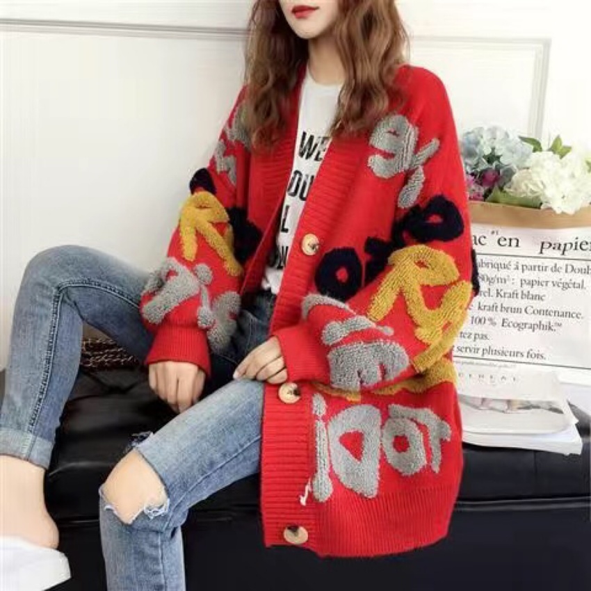 秋冬加绒加厚韩版打底女字母加厚宽松慵懒针织外套长袖毛衣开衫女