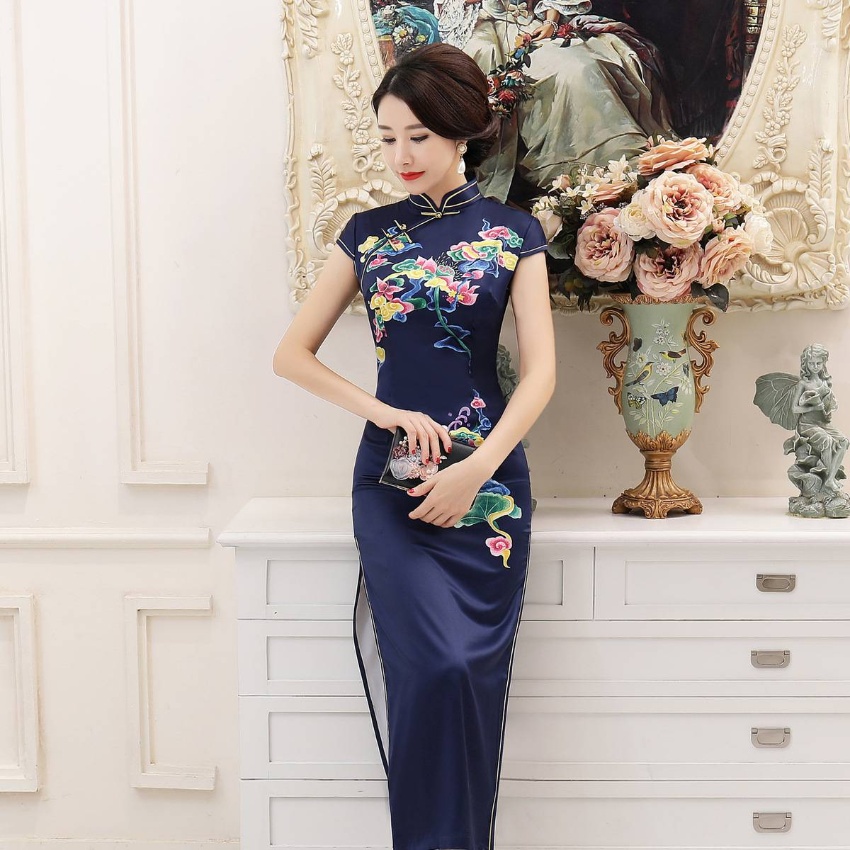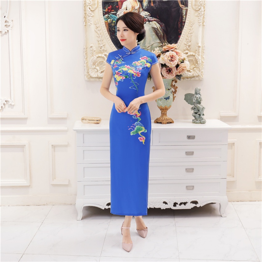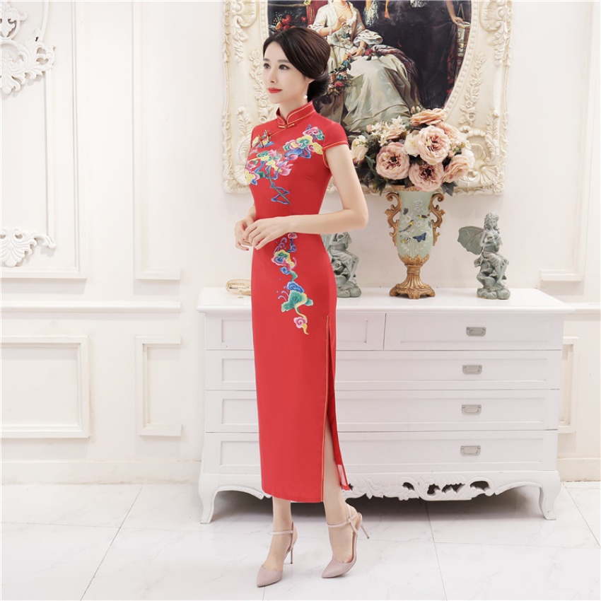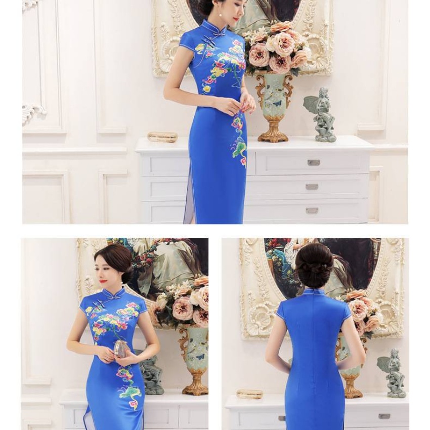 女装女2025新款春季长款定位花立领短袖走秀旗袍连衣裙宴会礼仪旗袍