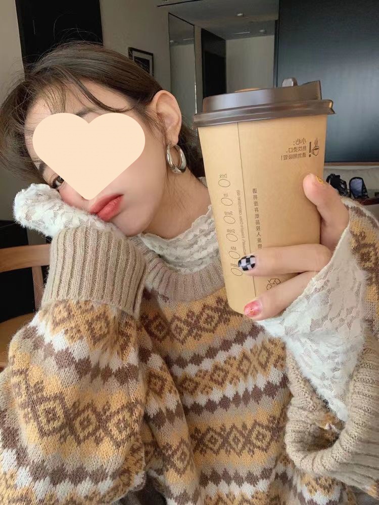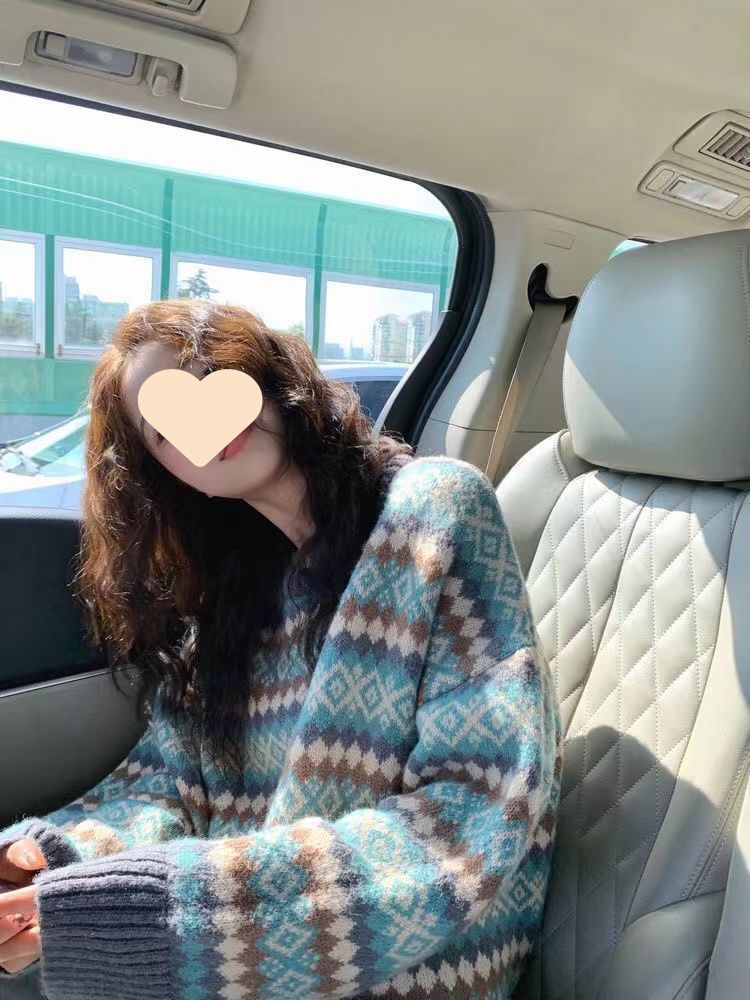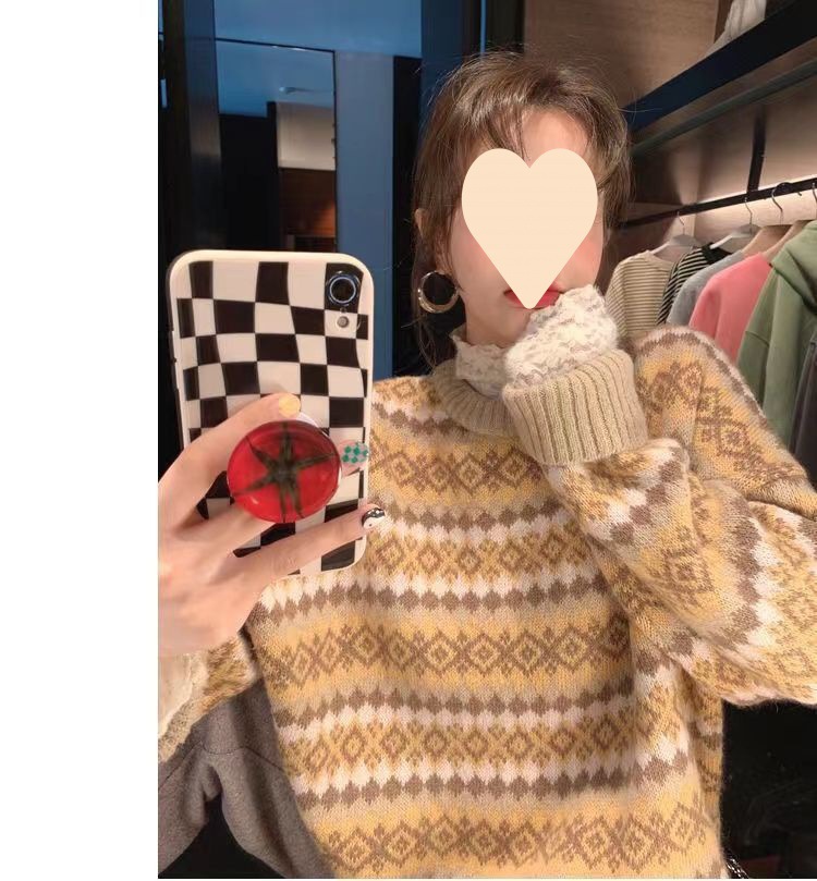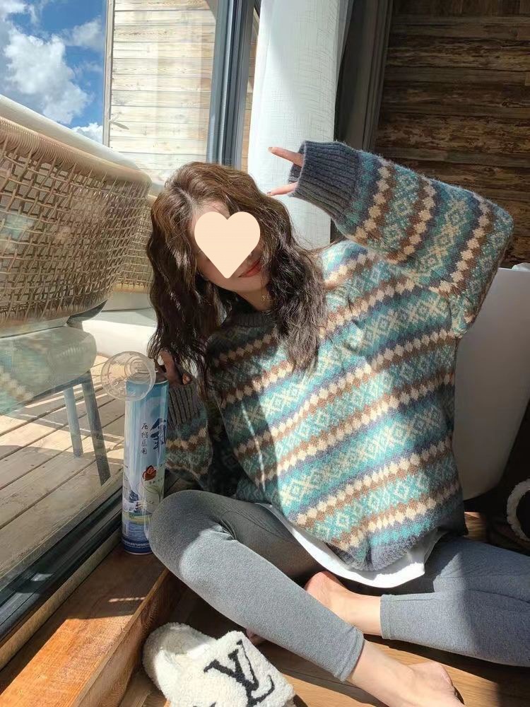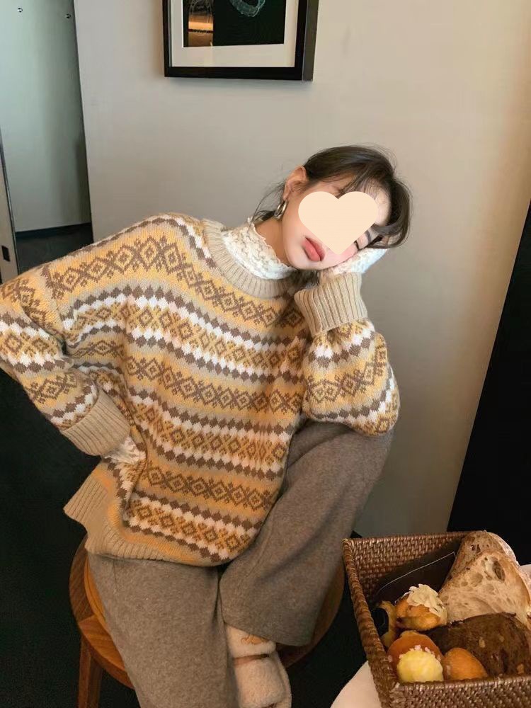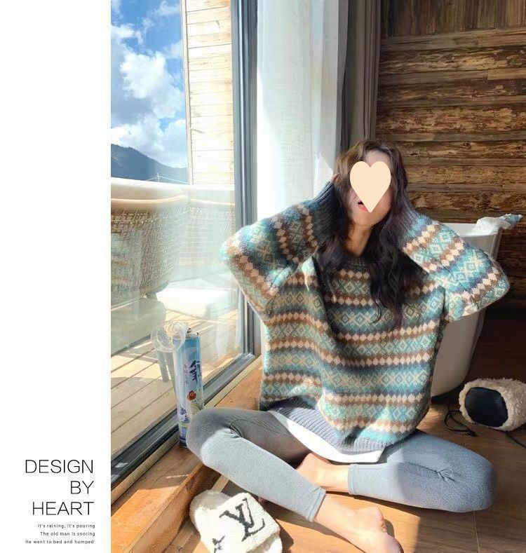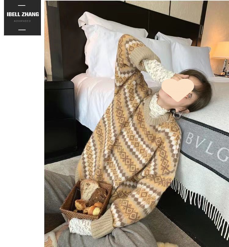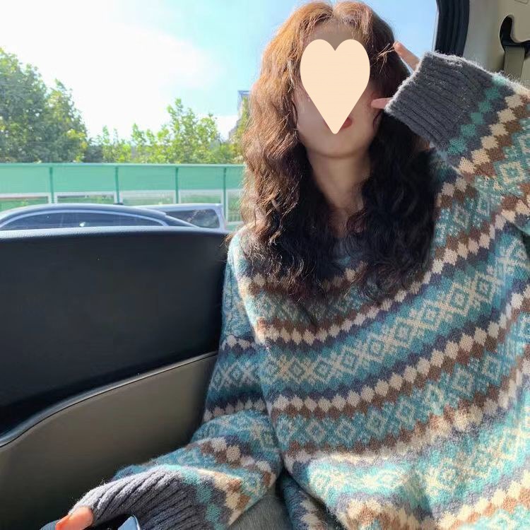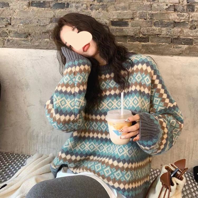 秋冬新款韩版宽松菱格毛衣女设计感小众针织衫复古休闲慵懒风