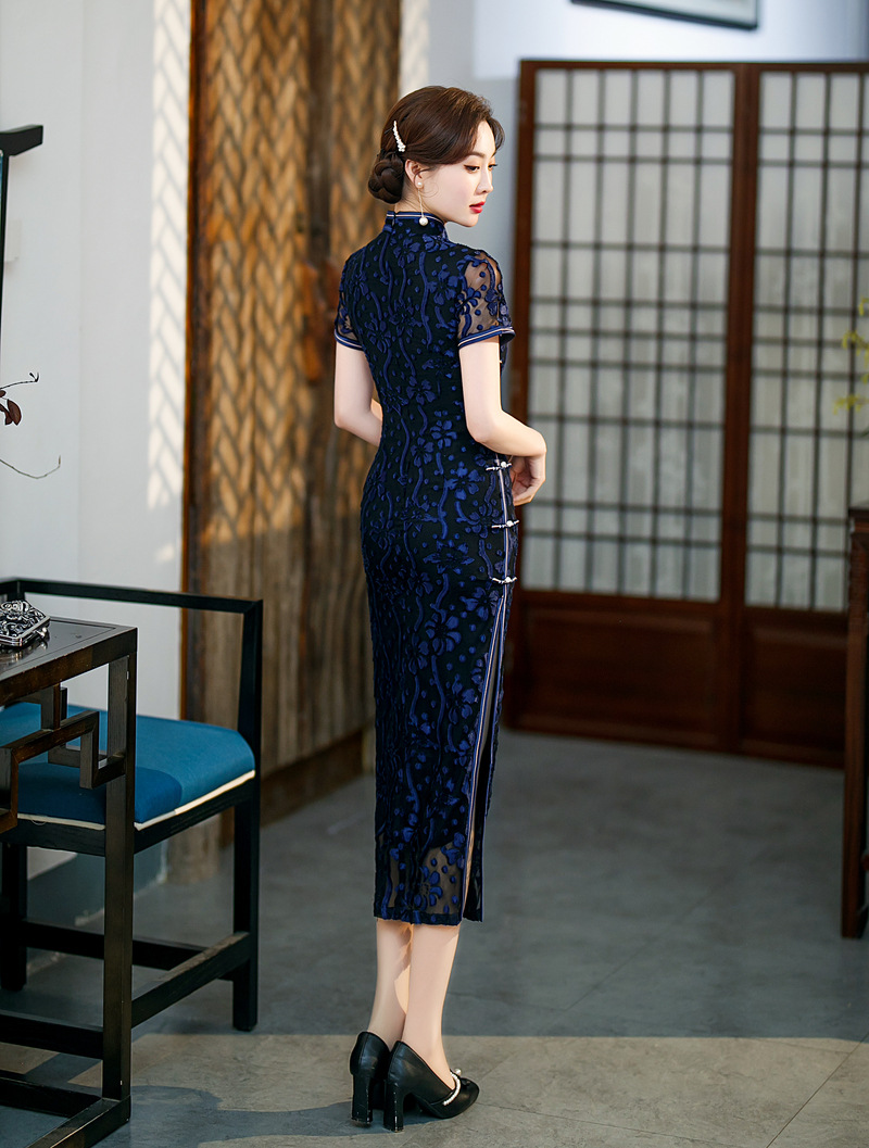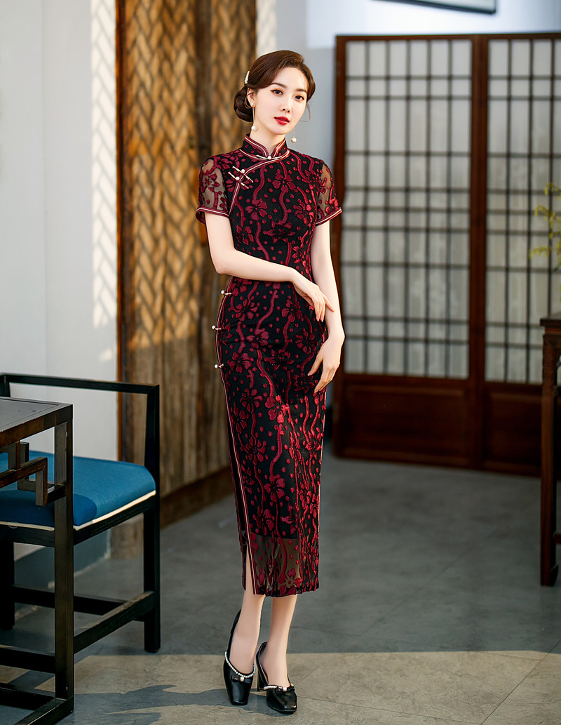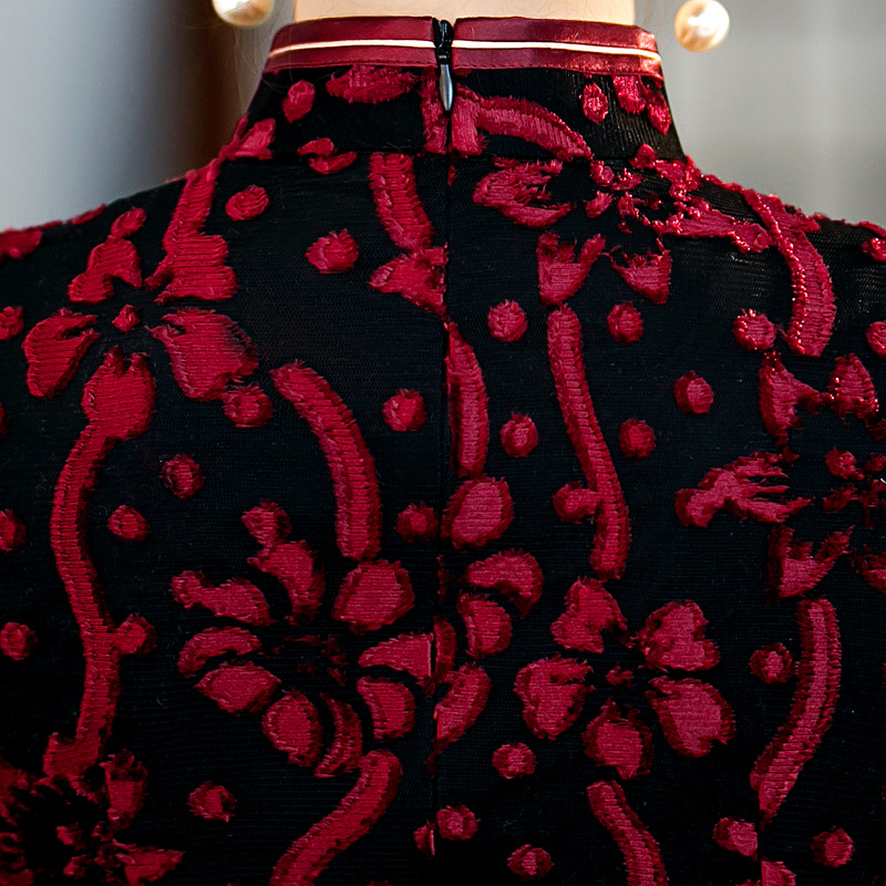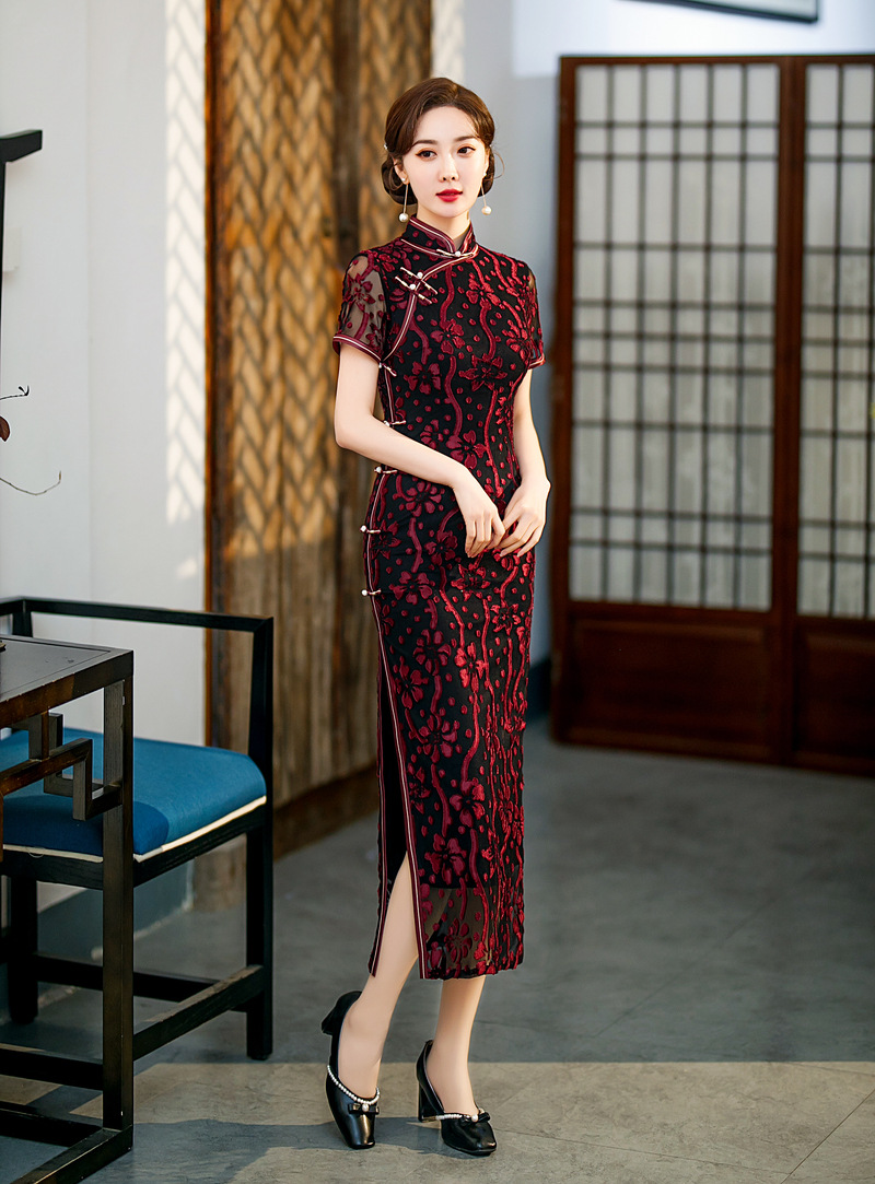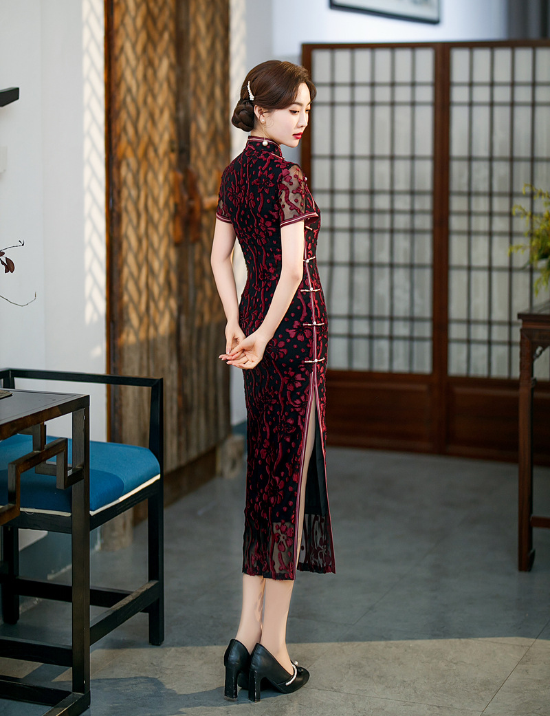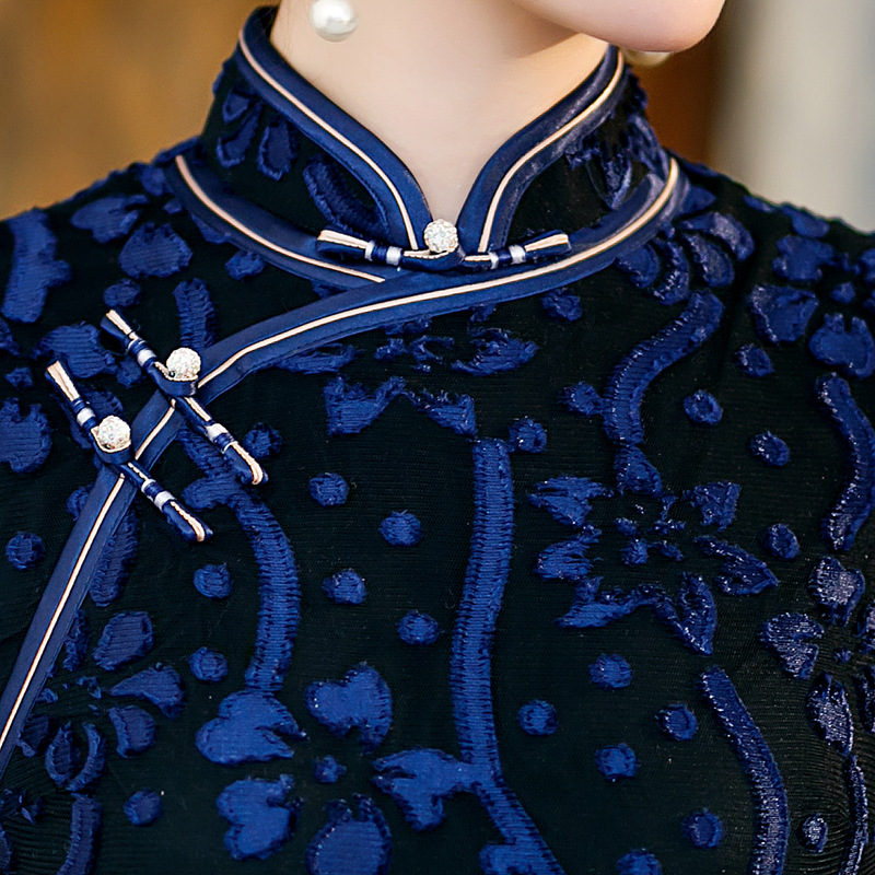 【旗多多】爆款立体烂花绒中国风知性宴会礼服长款日常旗袍连衣裙