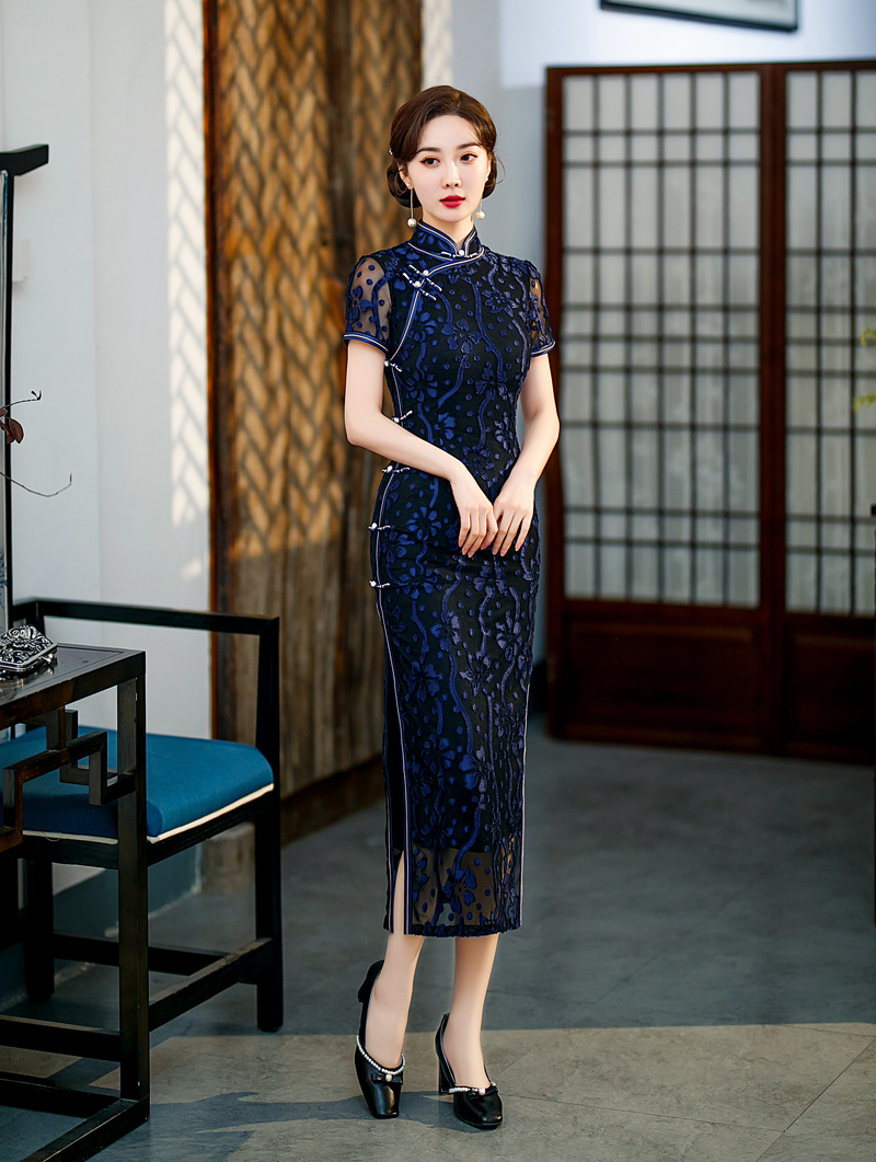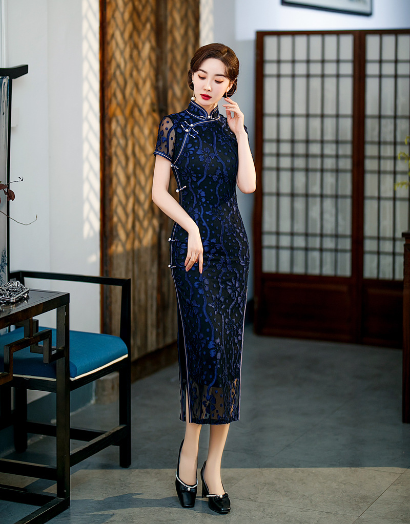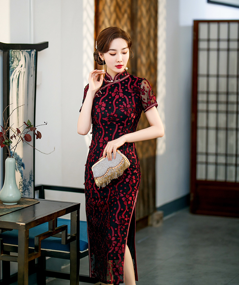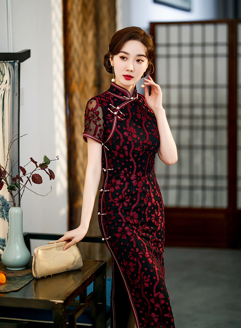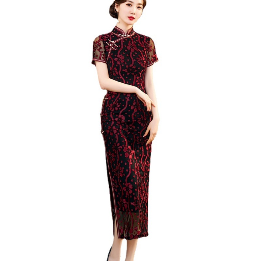 【旗多多】爆款立体烂花绒中国风知性宴会礼服长款日常旗袍连衣裙