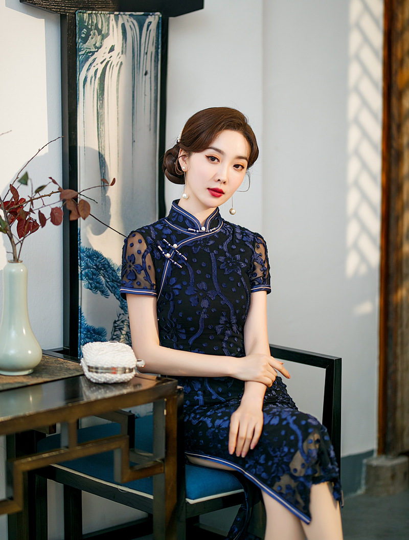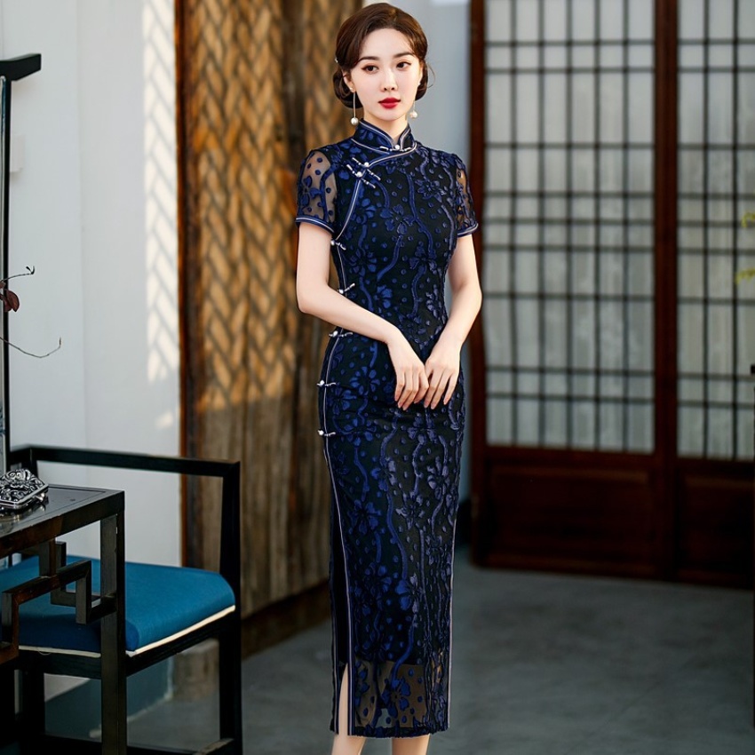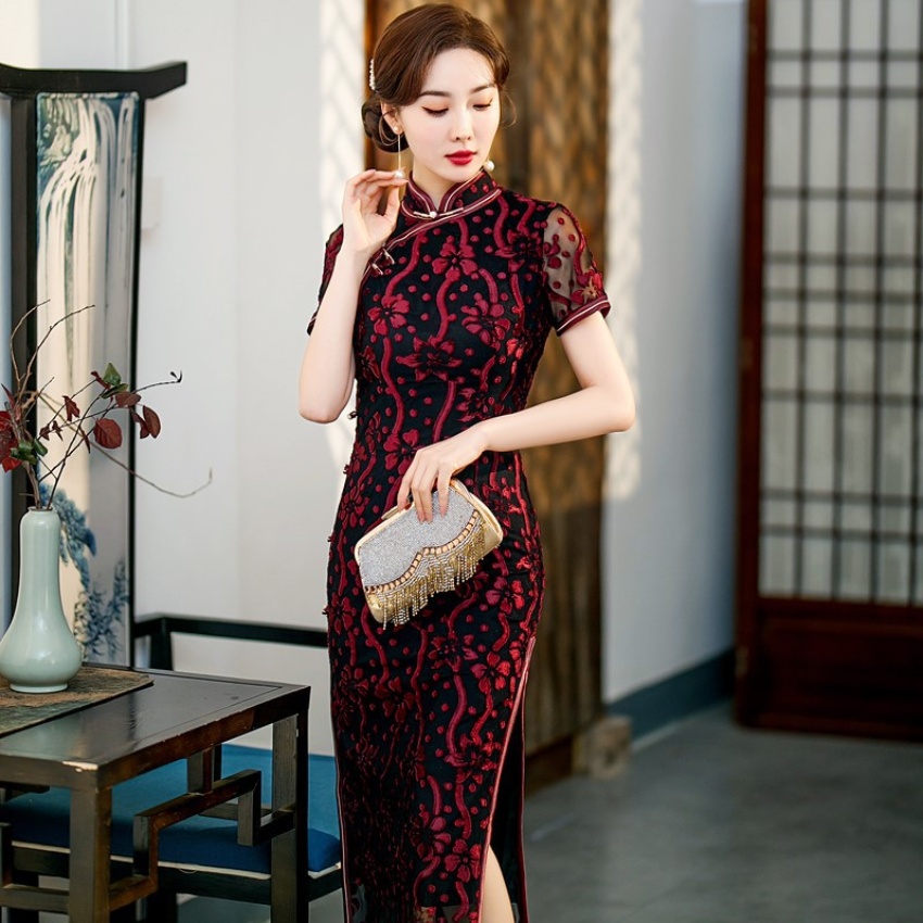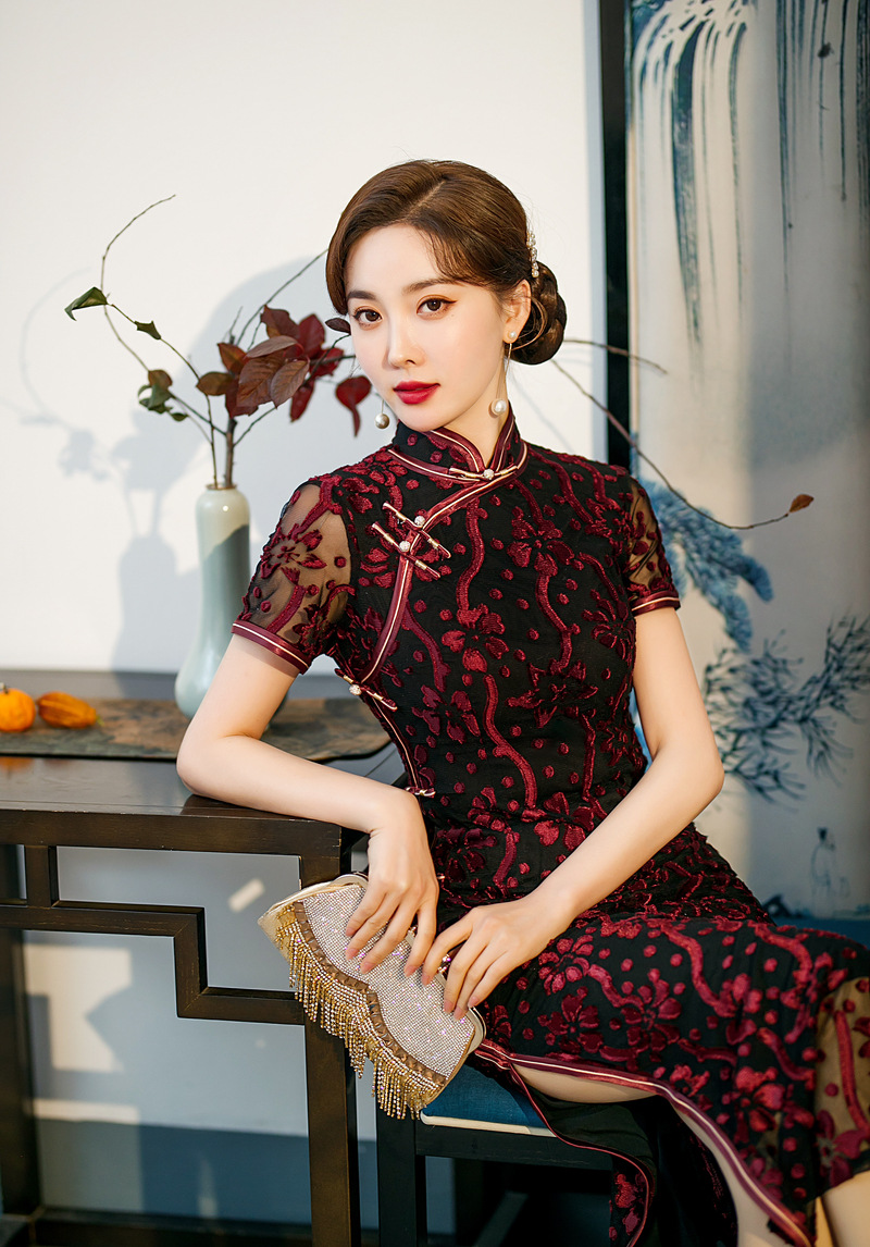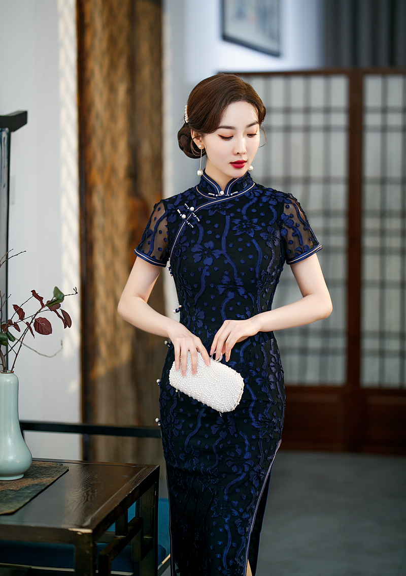 【旗多多】爆款立体烂花绒中国风知性宴会礼服长款日常旗袍连衣裙