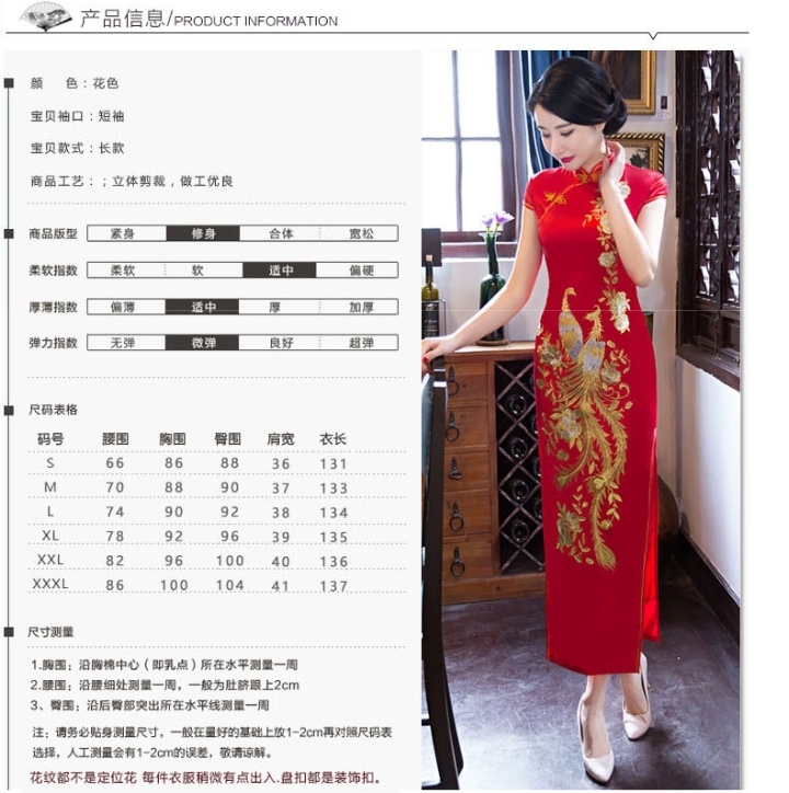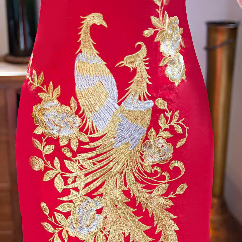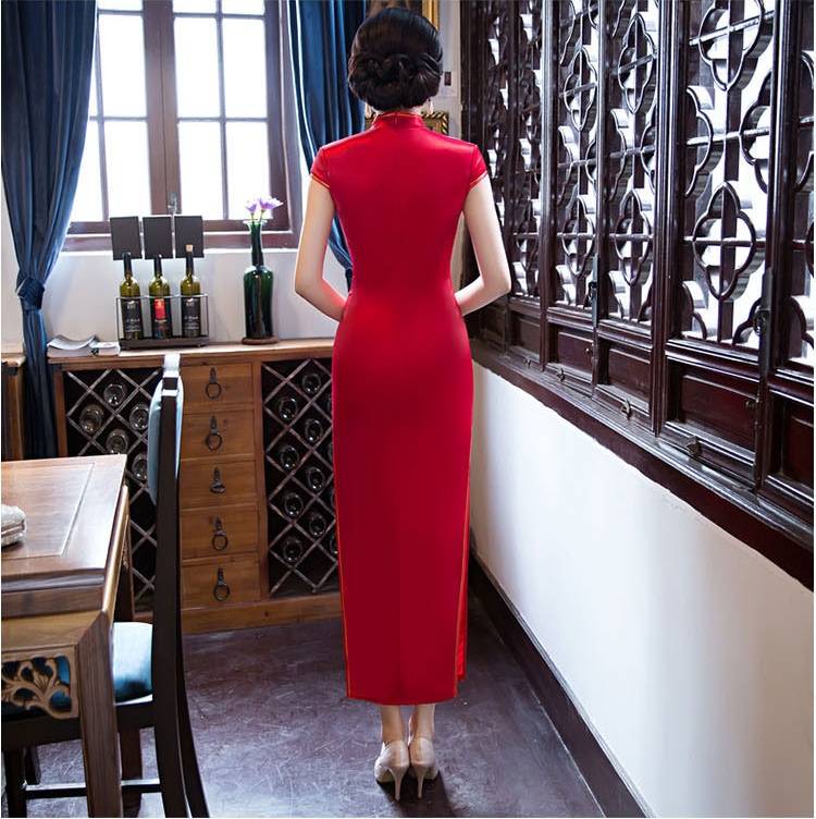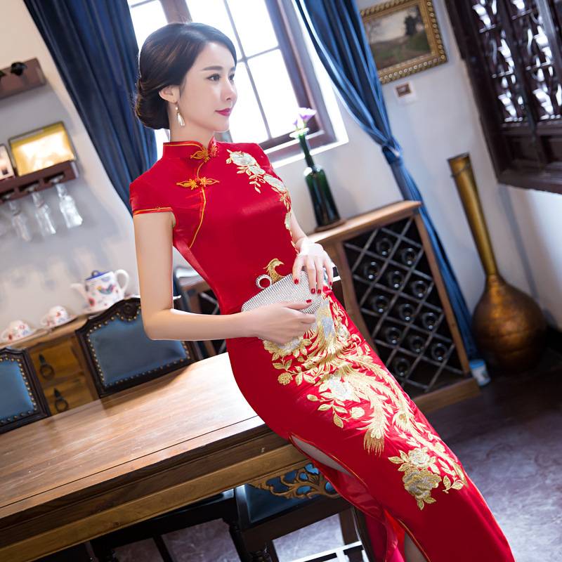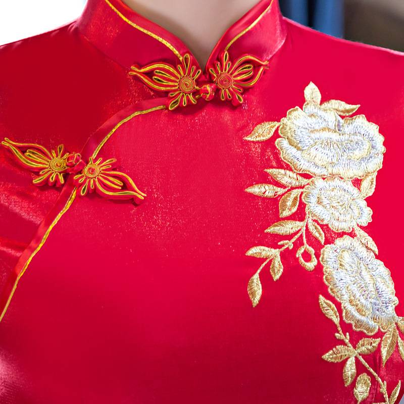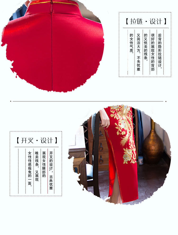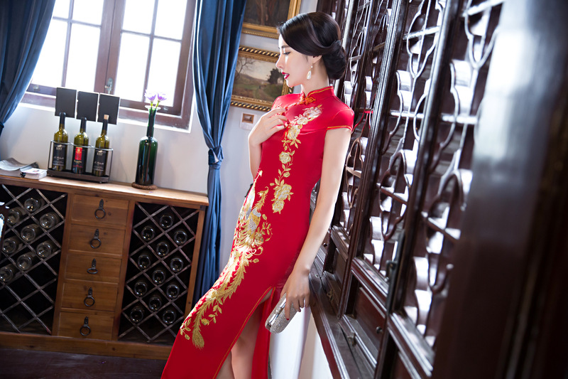 新娘款红绣花旗袍 立领长款短袖高开叉性感刺绣旗袍