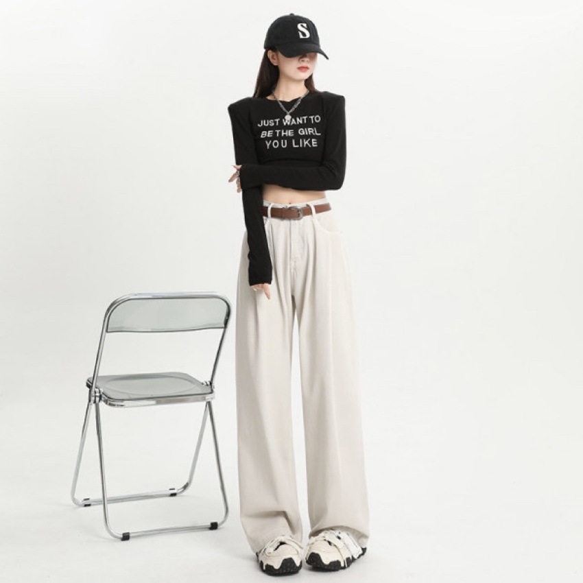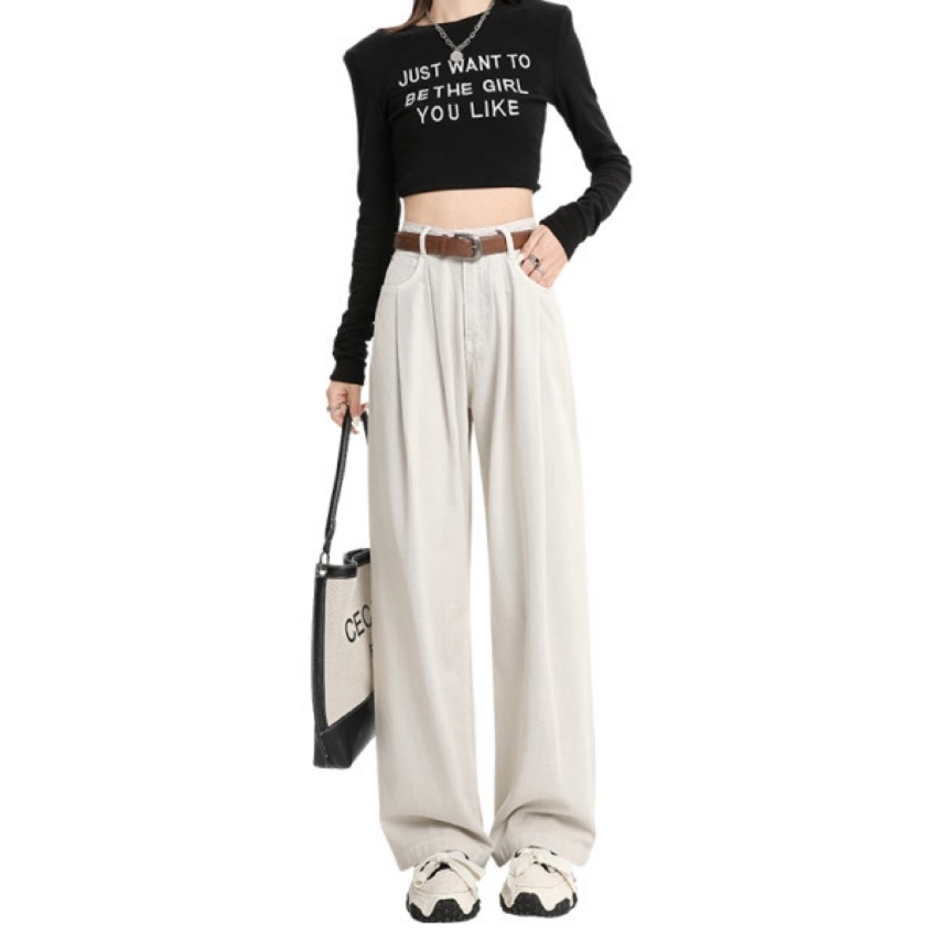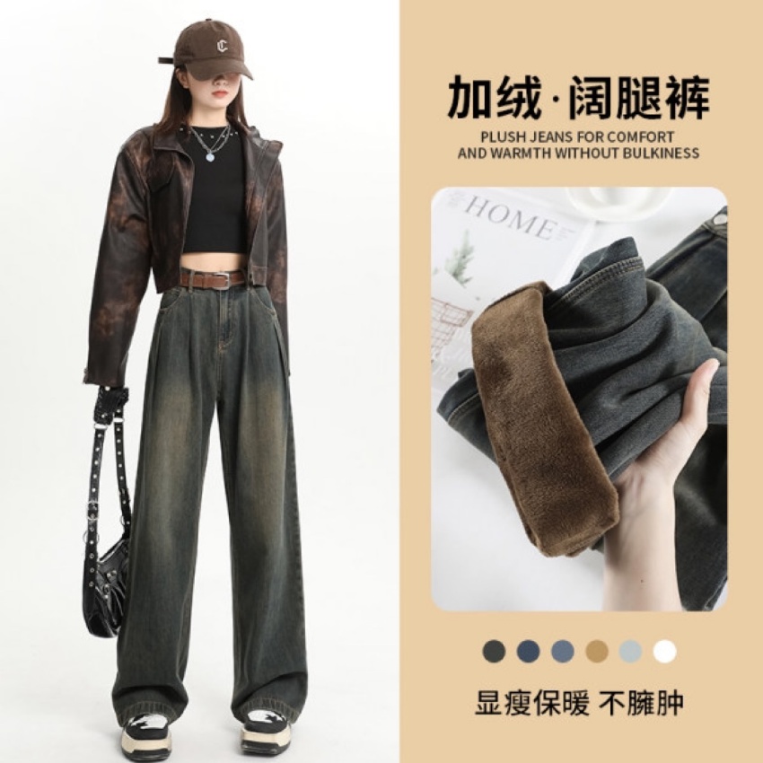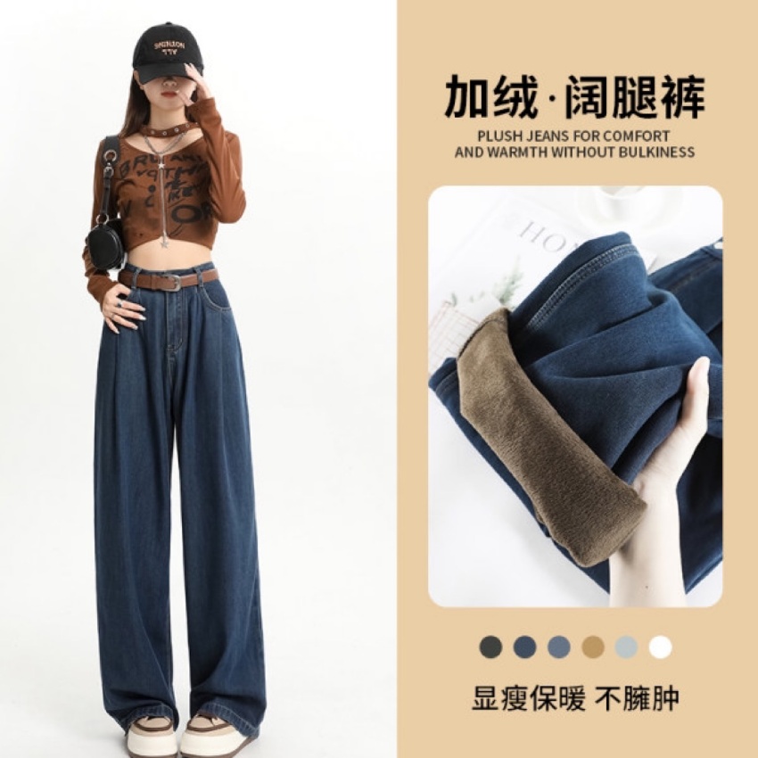 秋冬韩版加绒牛仔阔腿裤女高腰宽松显瘦褶皱设计感直筒拖地裤