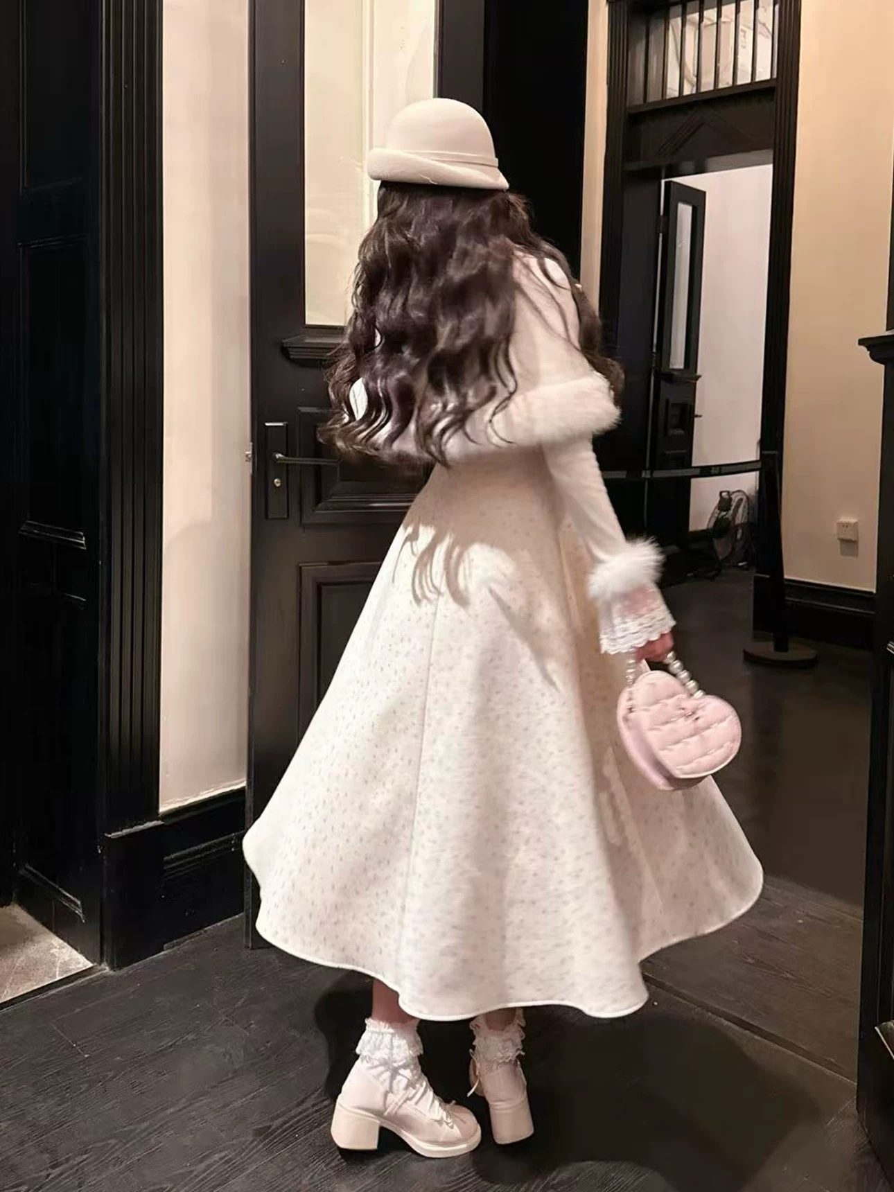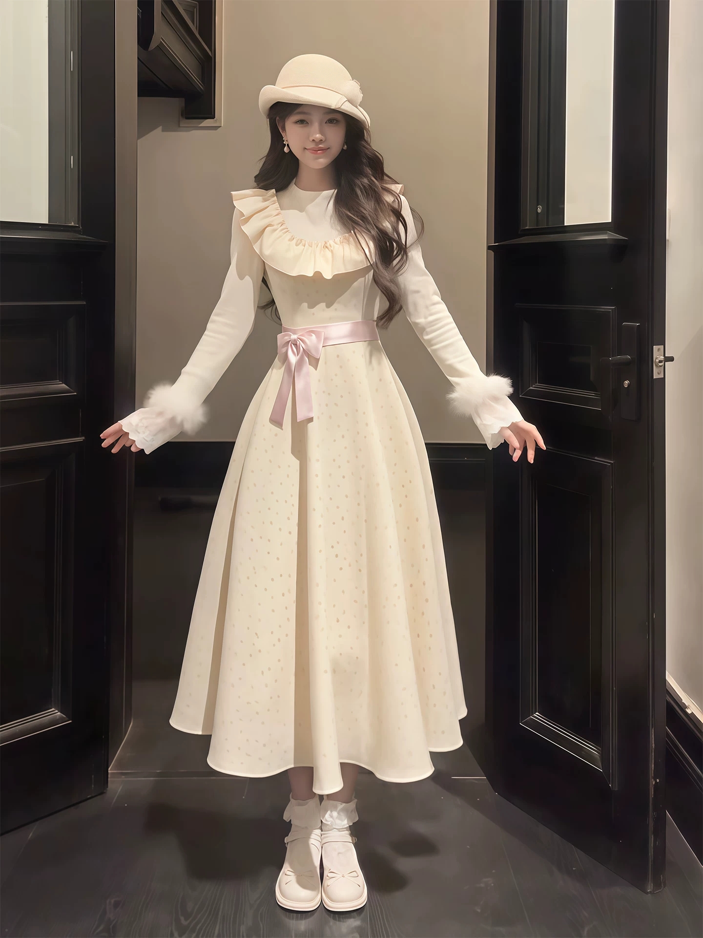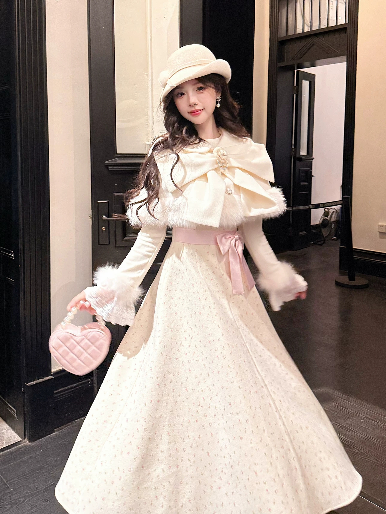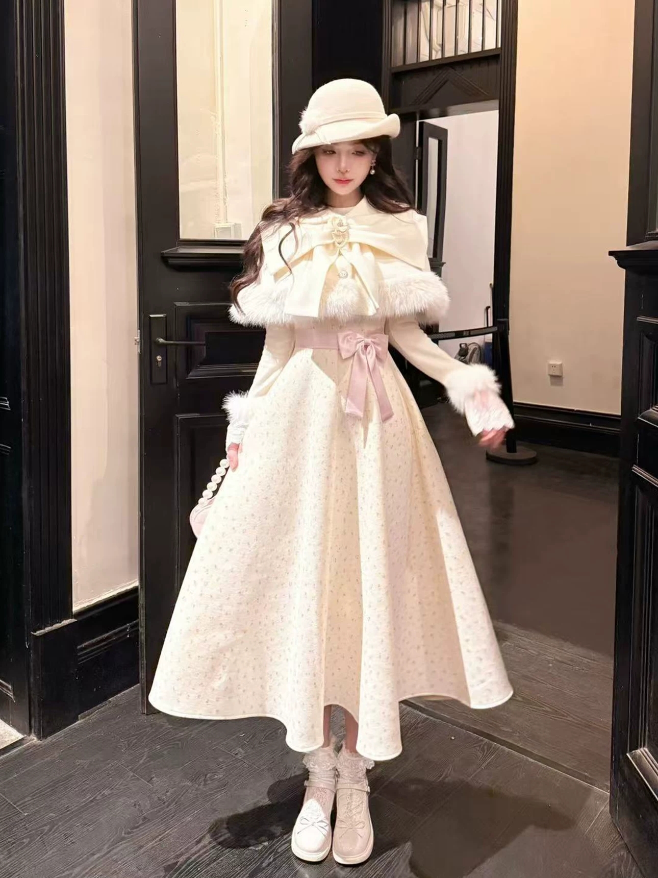 2026年新款桔梗house 繁花甜豆 甜美千金感穿搭蝴蝶结毛边斗篷连衣裙套装女
