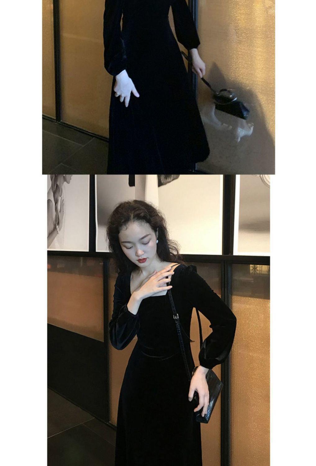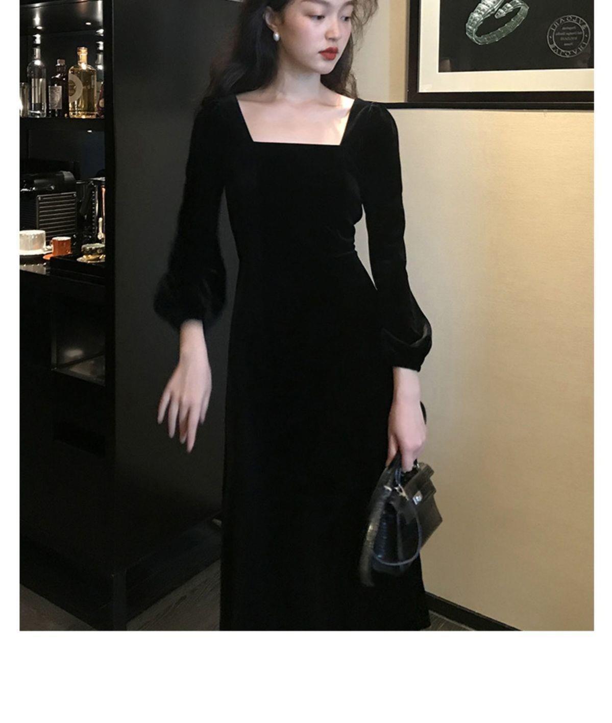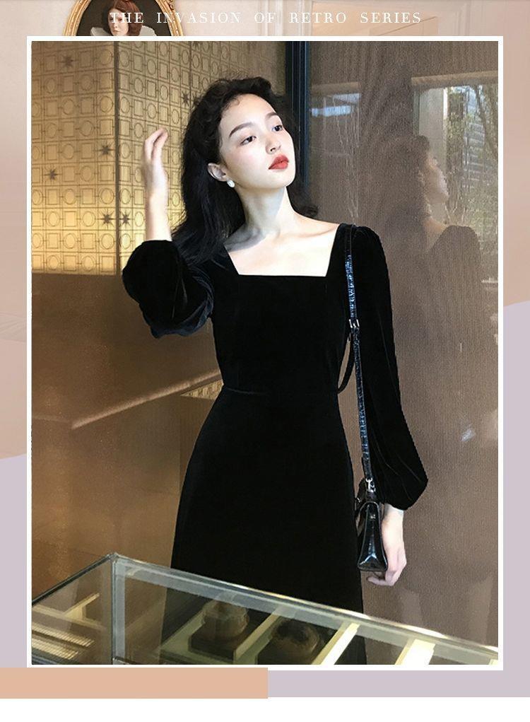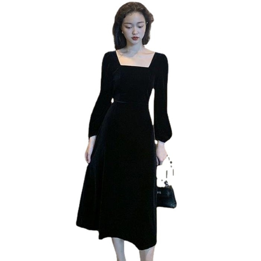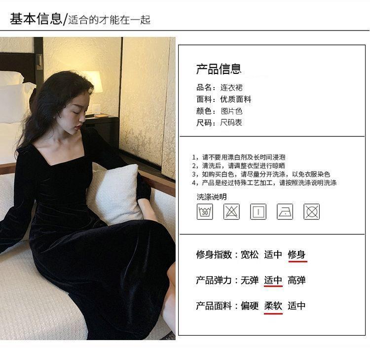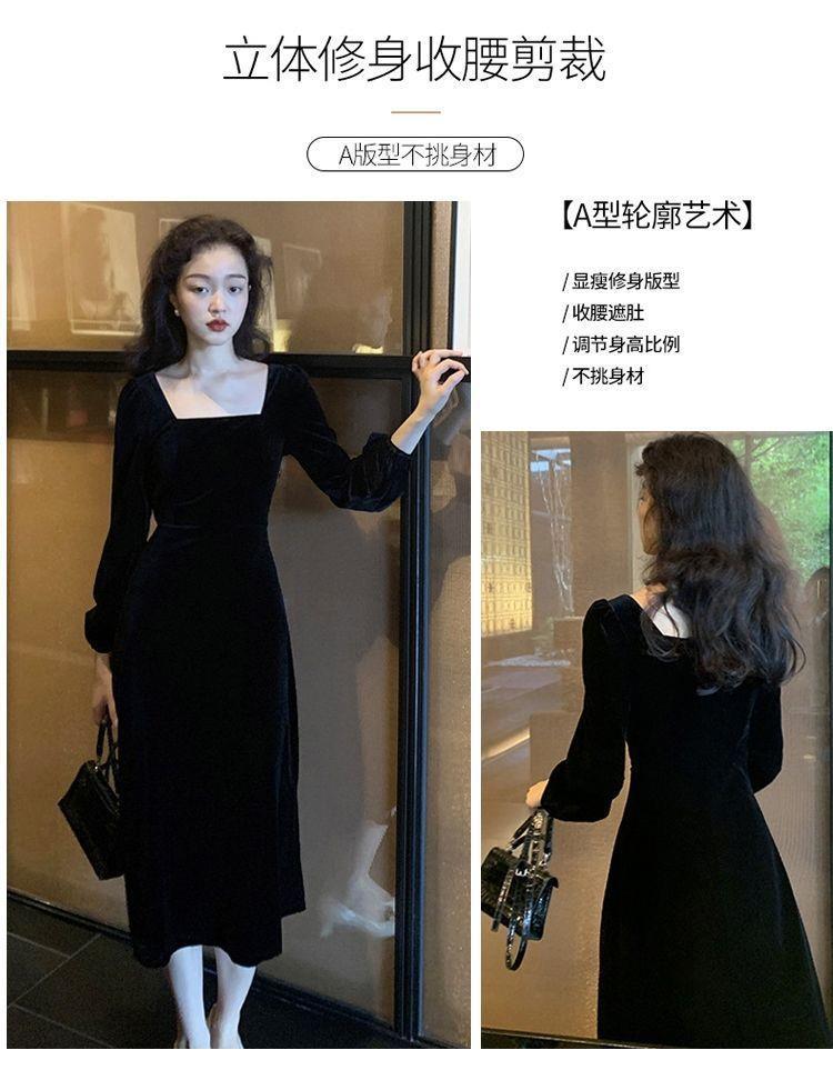 2026秋冬高端金丝绒连衣裙法式赫本风收腰长裙气质女神范方领礼服