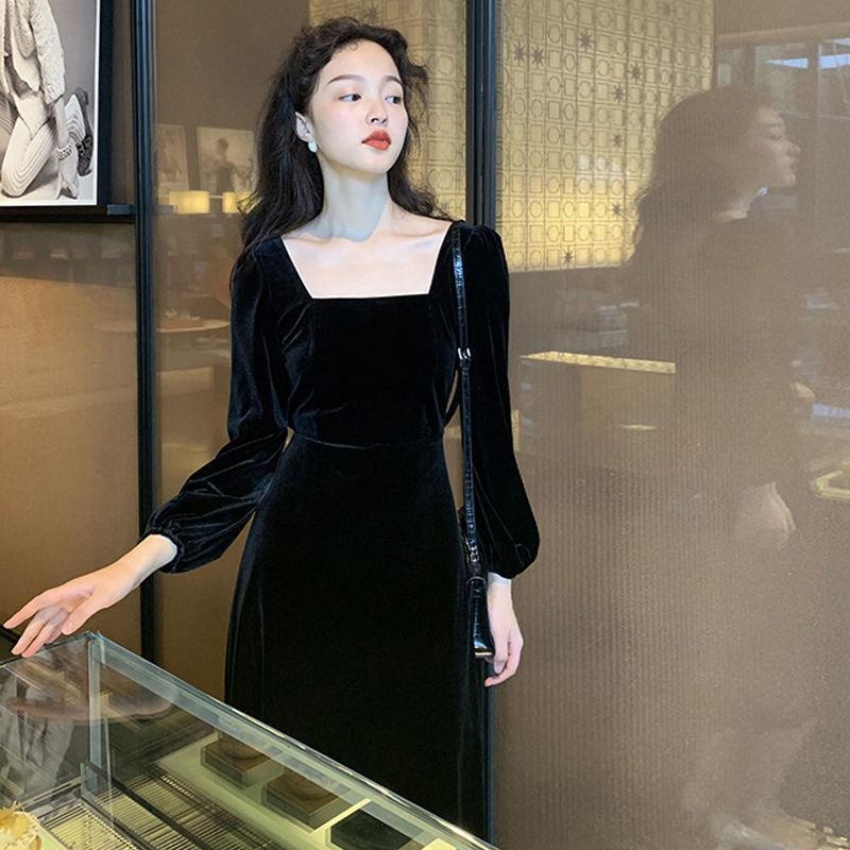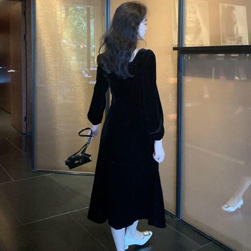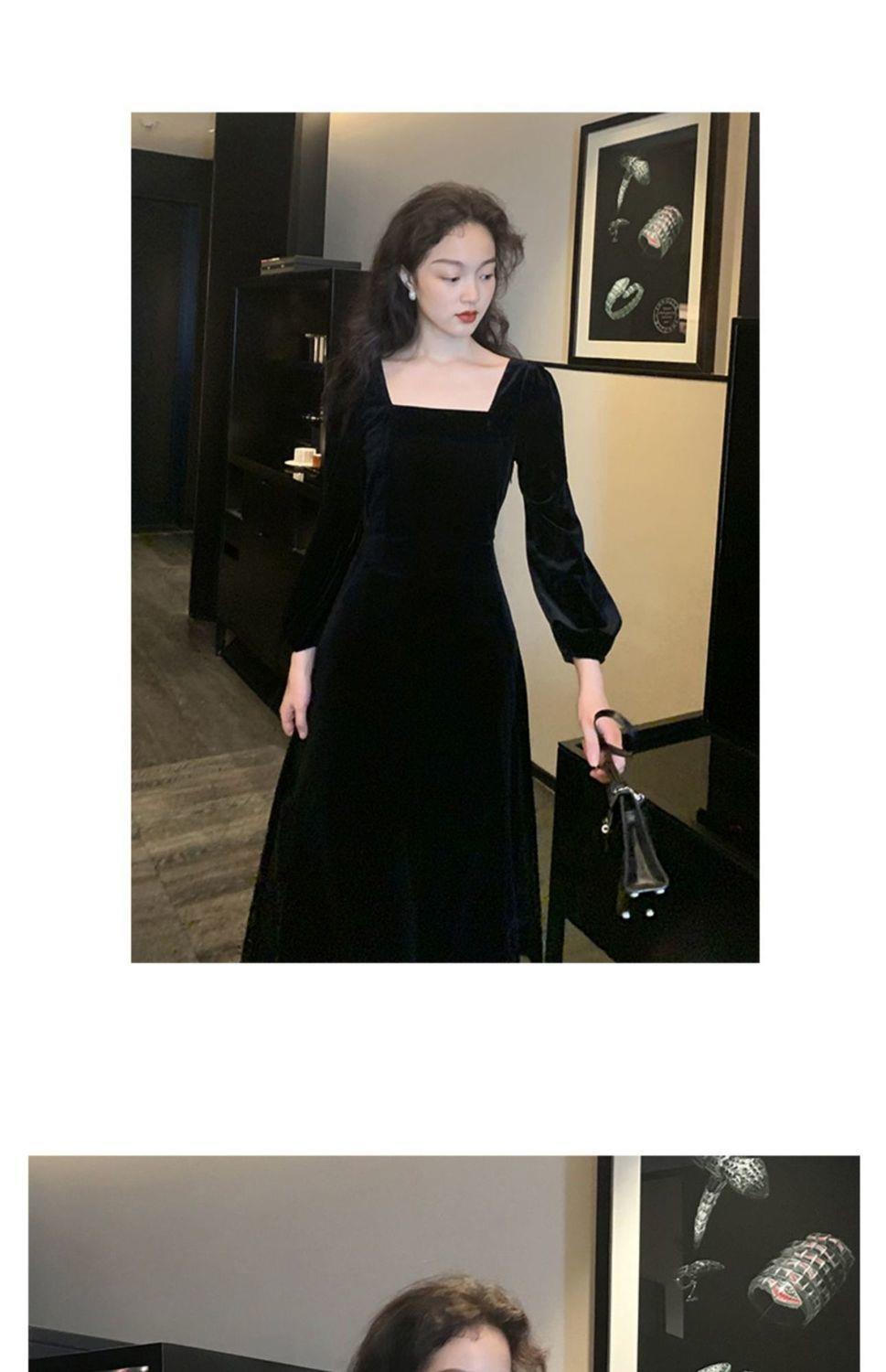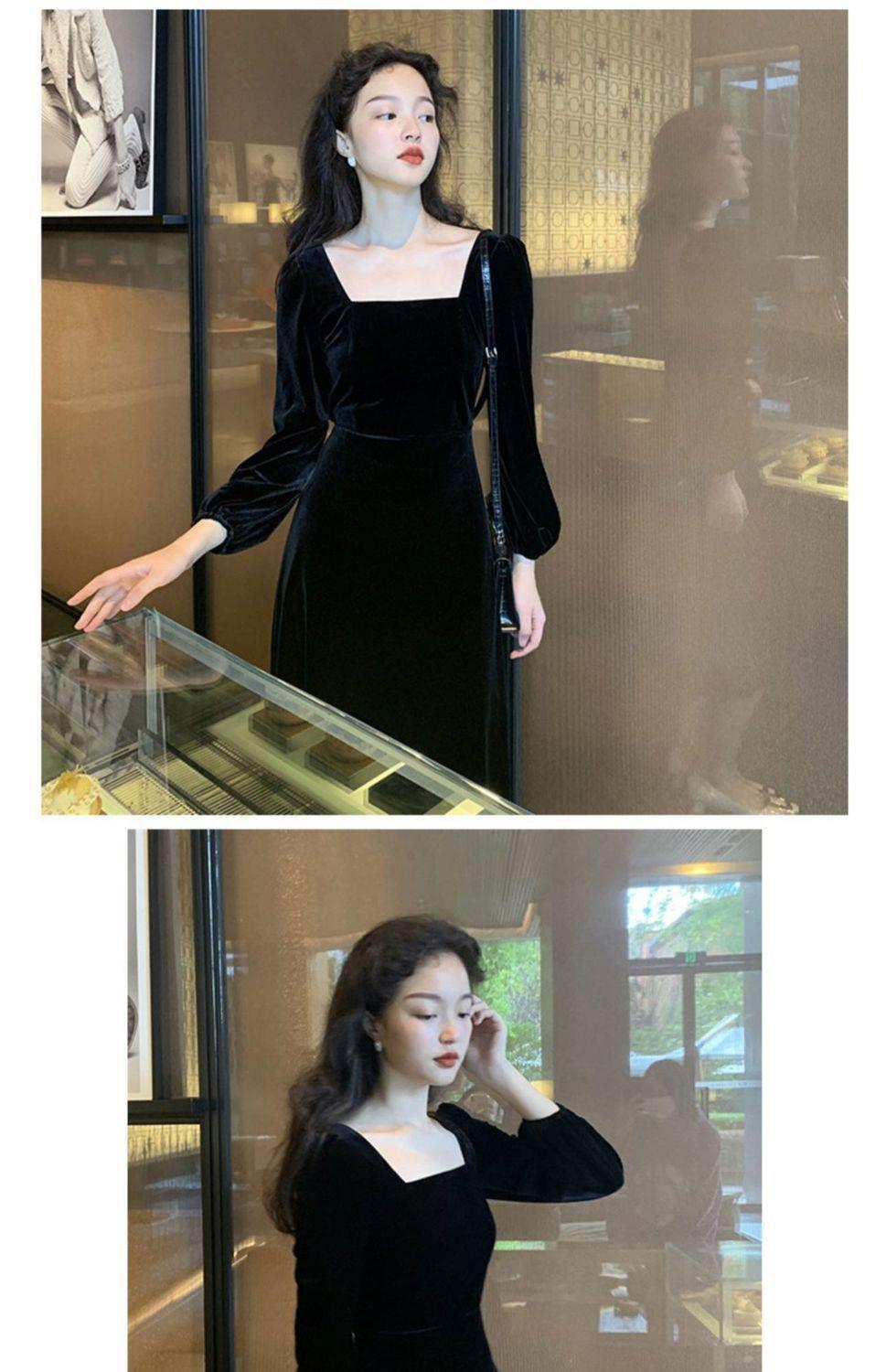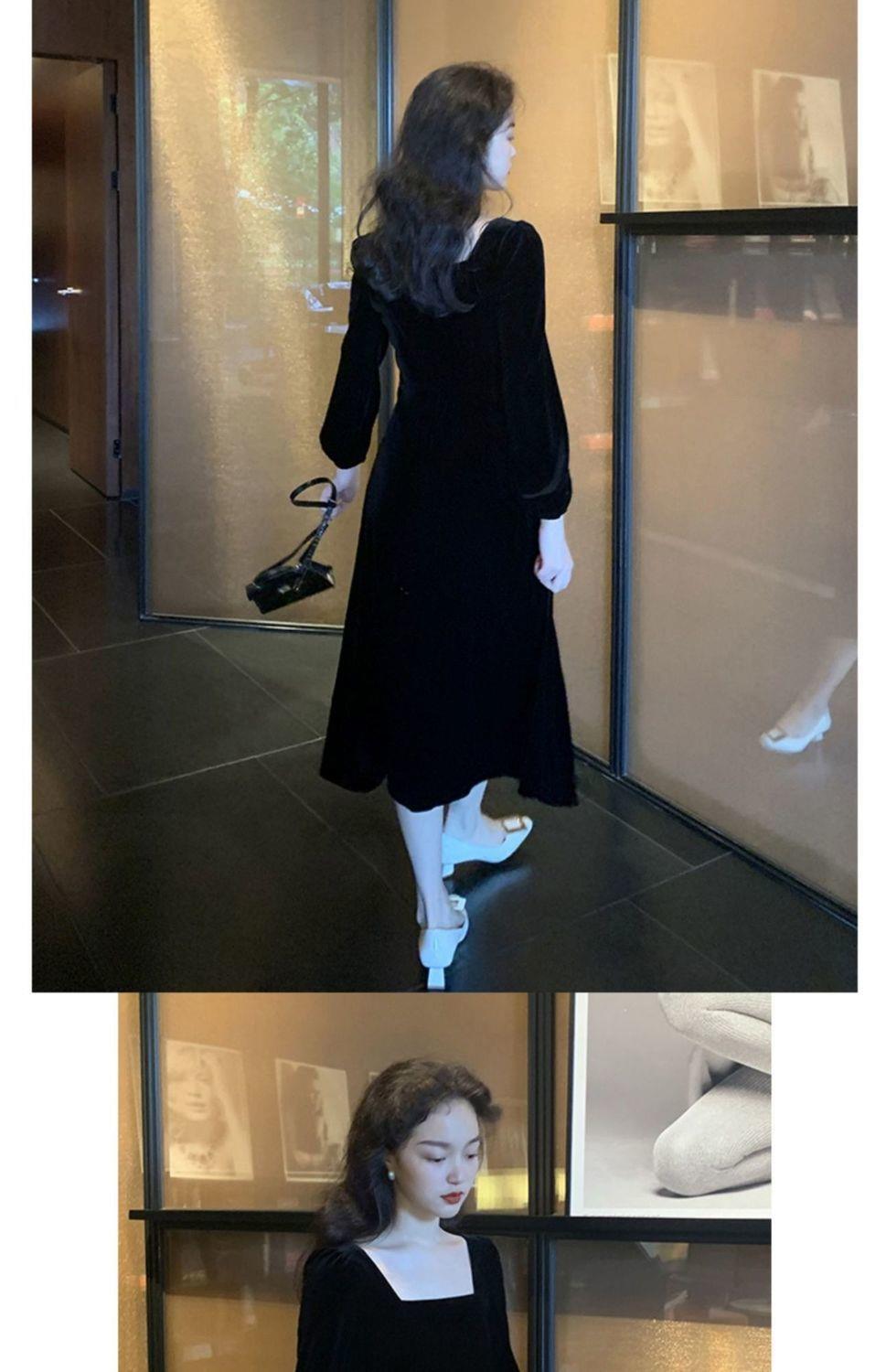 2026秋冬高端金丝绒连衣裙法式赫本风收腰长裙气质女神范方领礼服