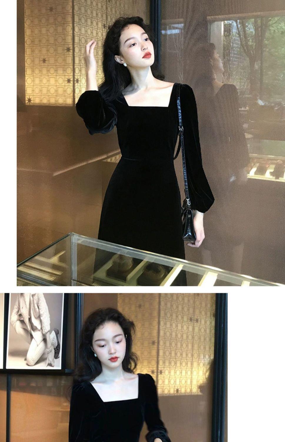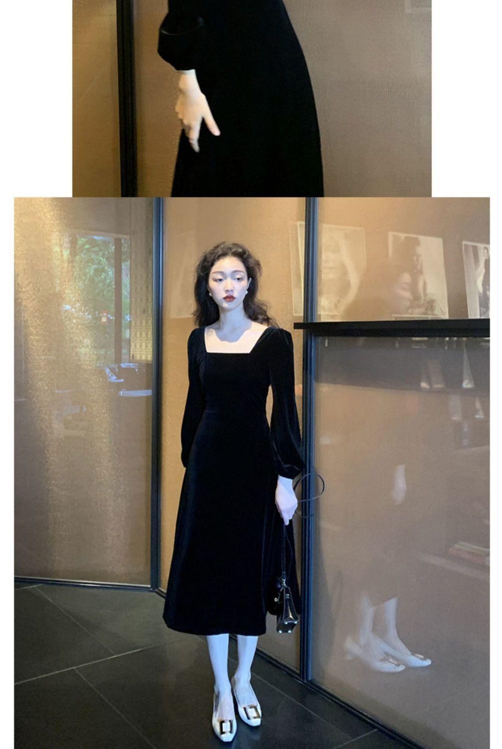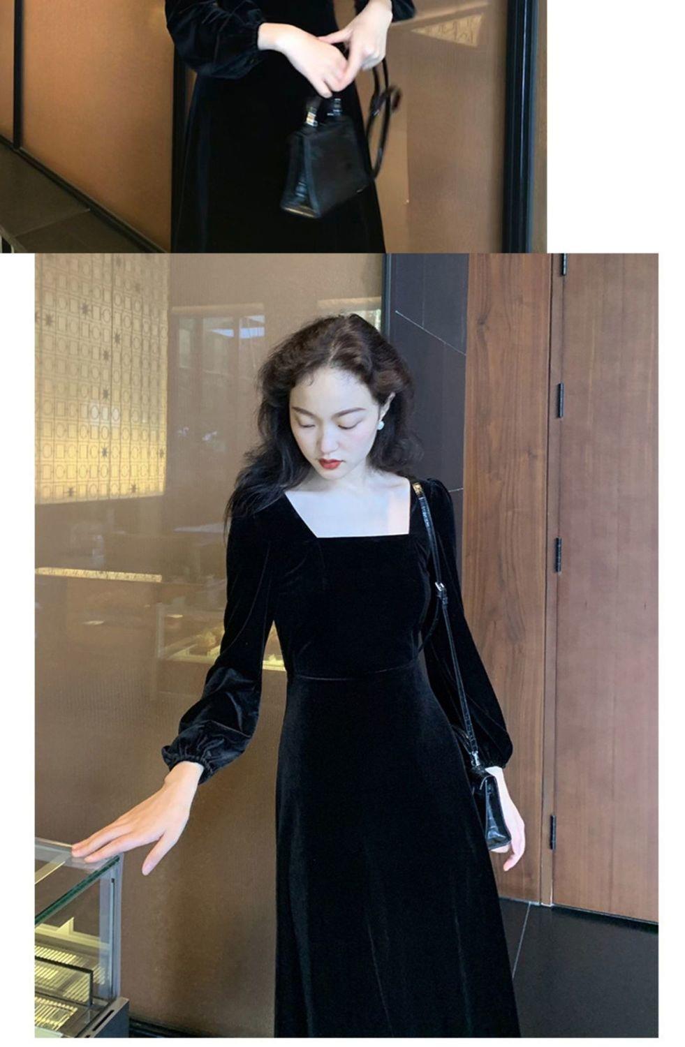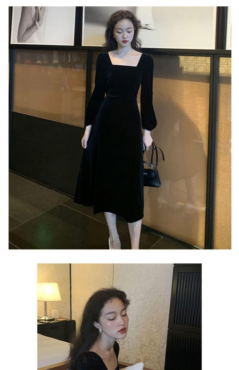 2026秋冬高端金丝绒连衣裙法式赫本风收腰长裙气质女神范方领礼服
