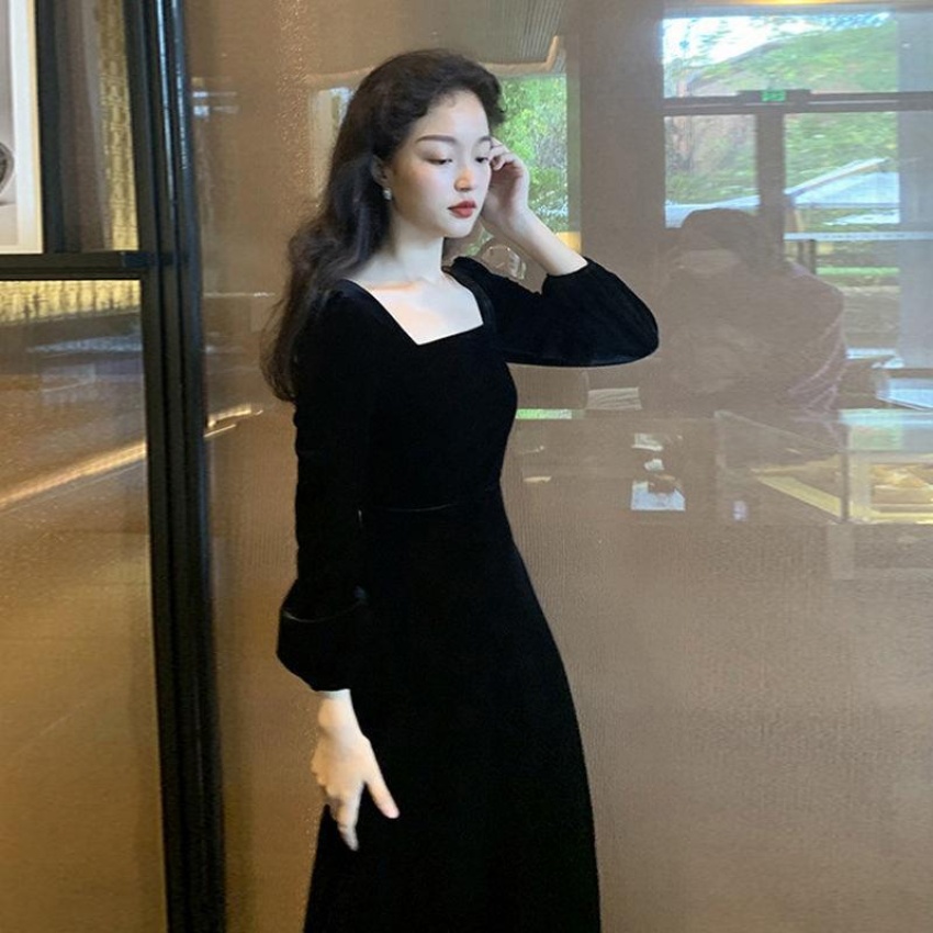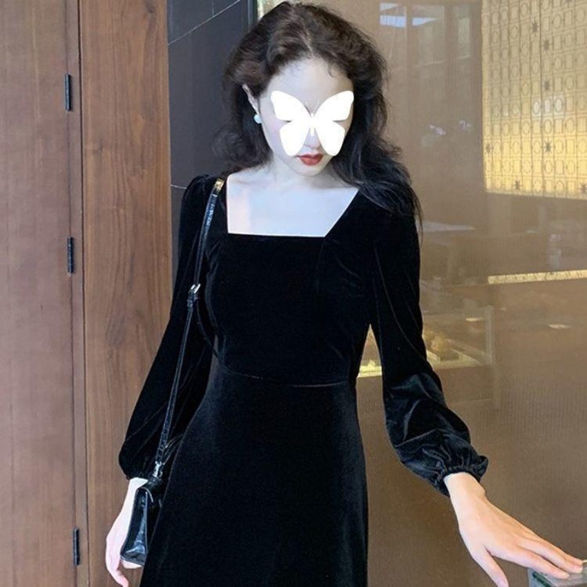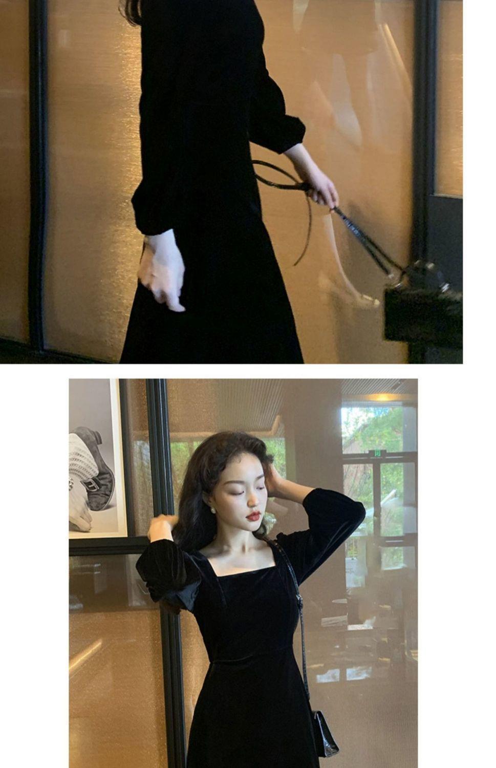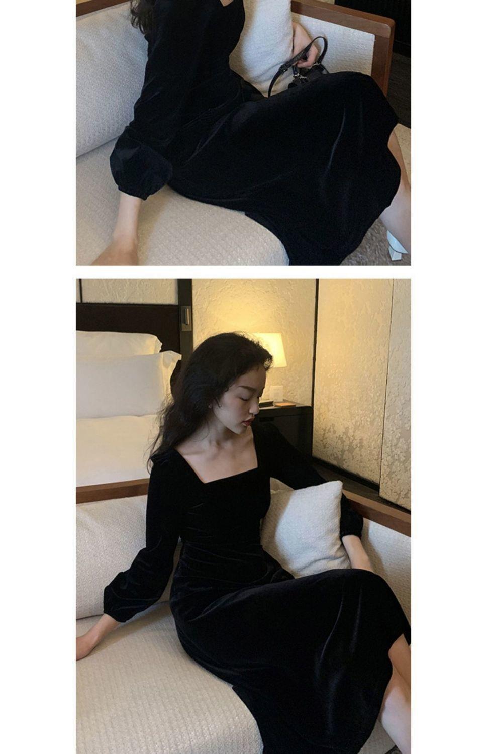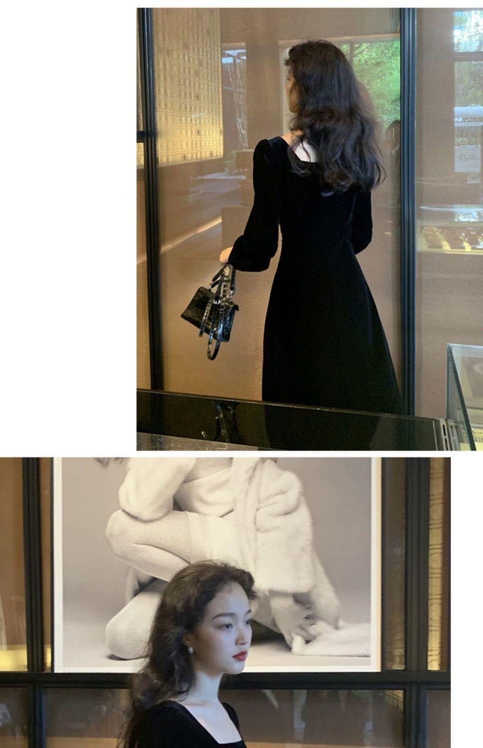 2026秋冬高端金丝绒连衣裙法式赫本风收腰长裙气质女神范方领礼服