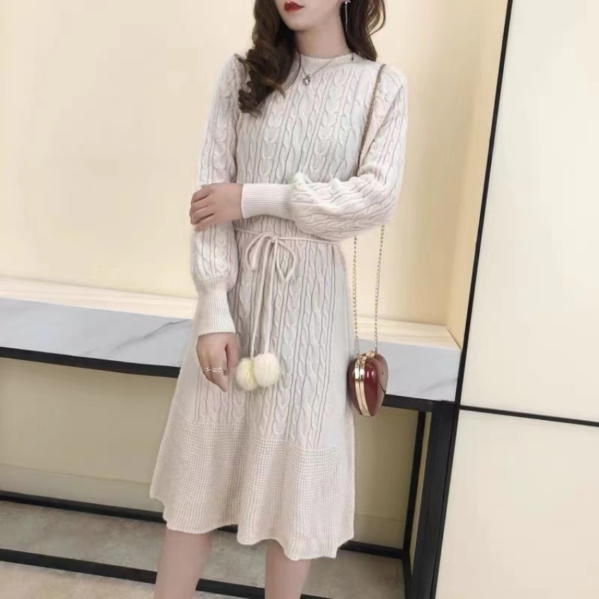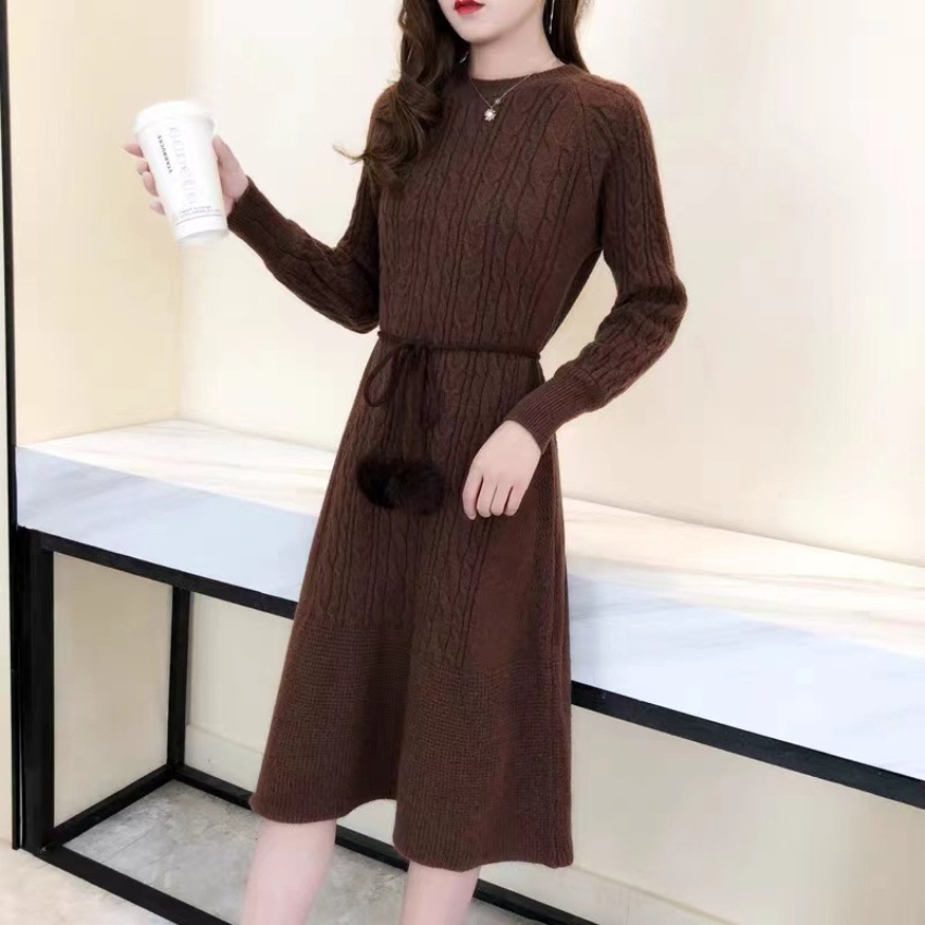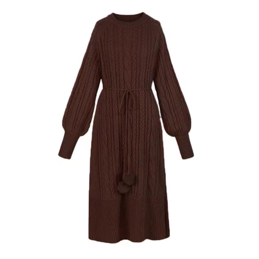 跨境毛衣2026冬季新品韩版气质圆领系带麻花针织拼接A字型连衣裙