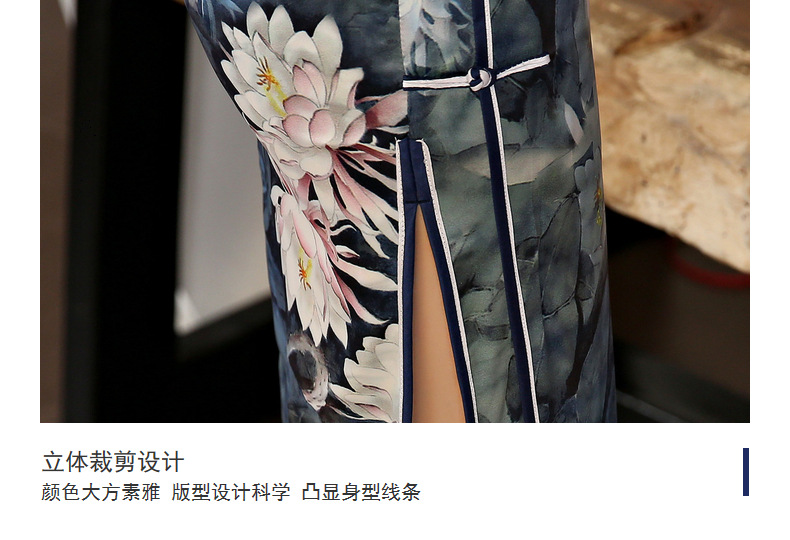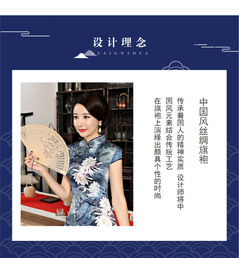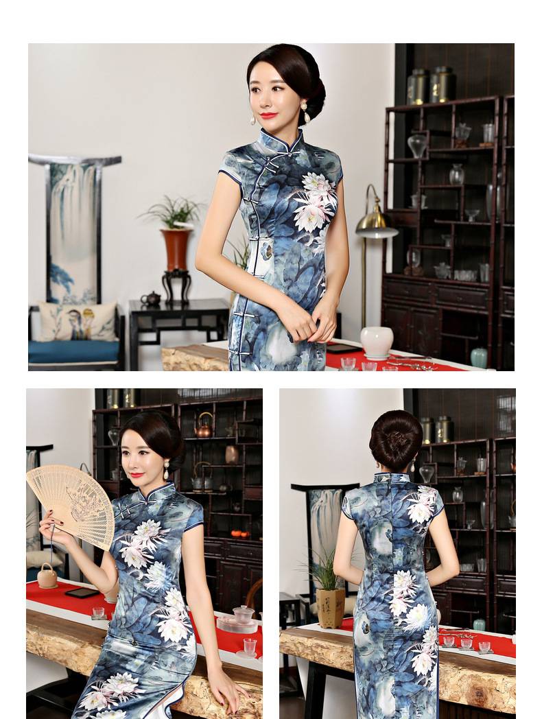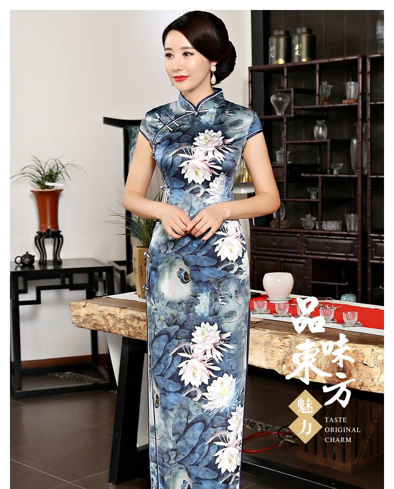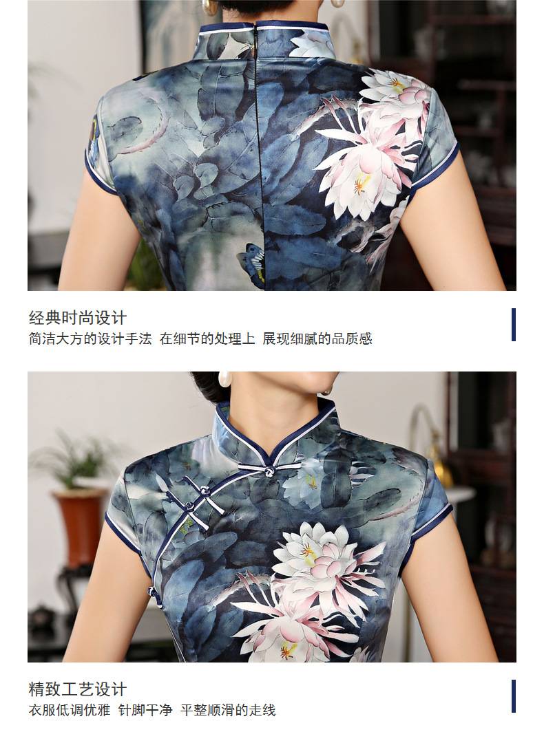 女装2018新款春季长款立领短袖走秀旗袍连衣裙 素色荷花丝绸旗袍