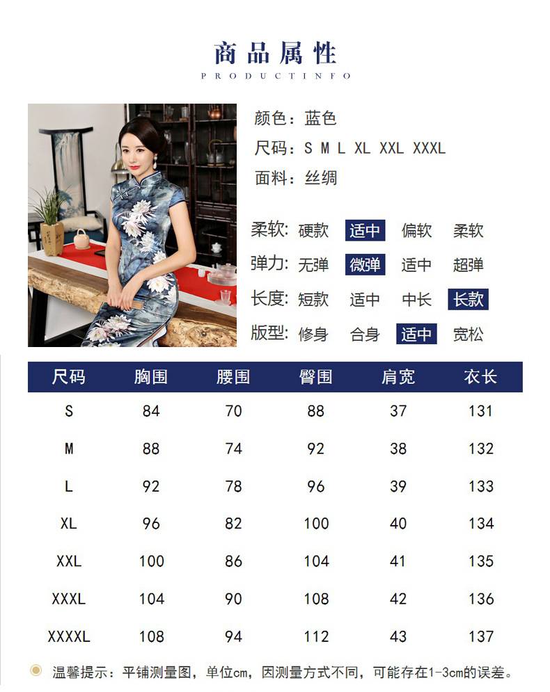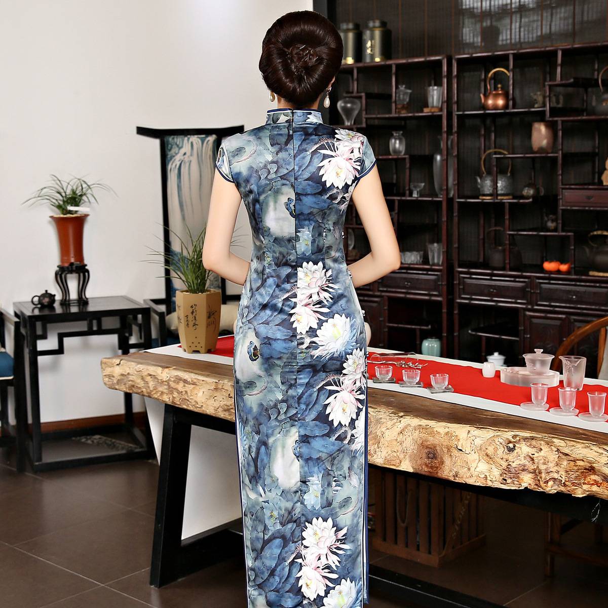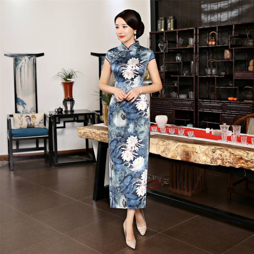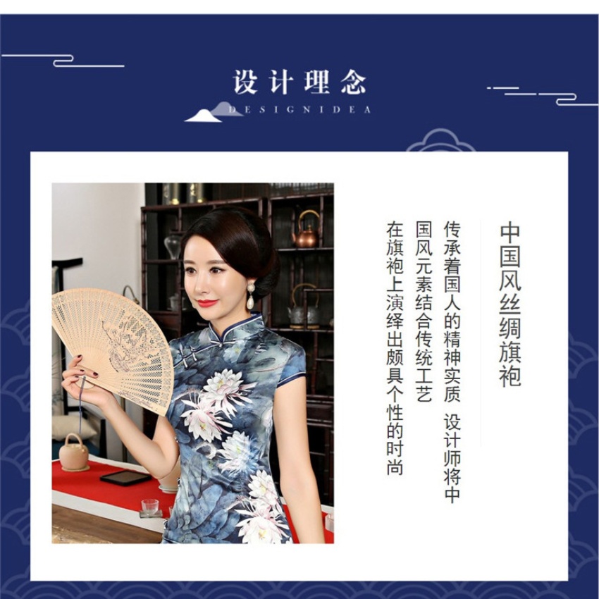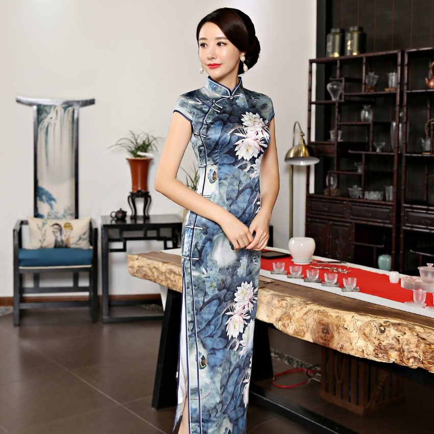 女装2018新款春季长款立领短袖走秀旗袍连衣裙 素色荷花丝绸旗袍