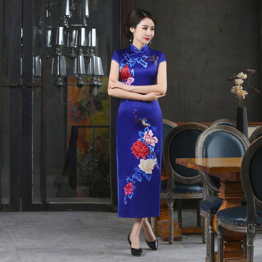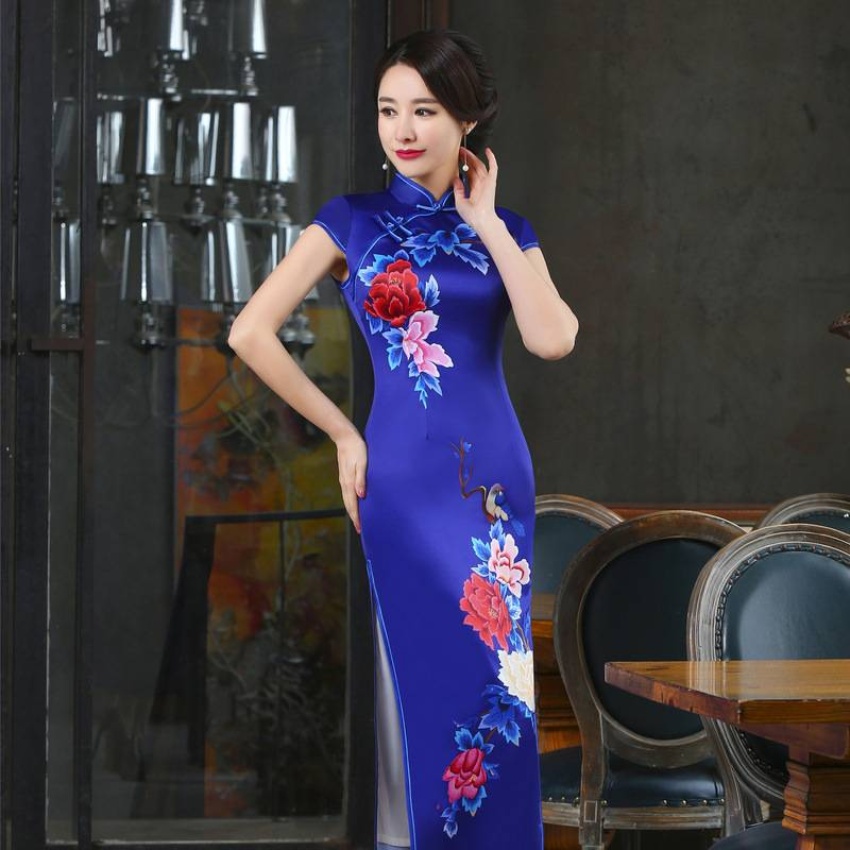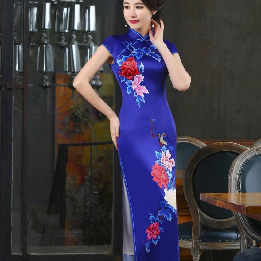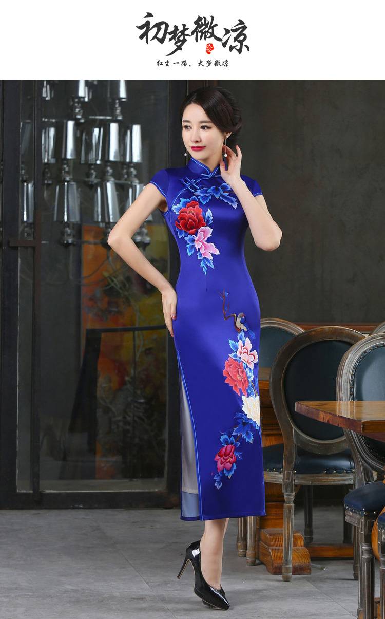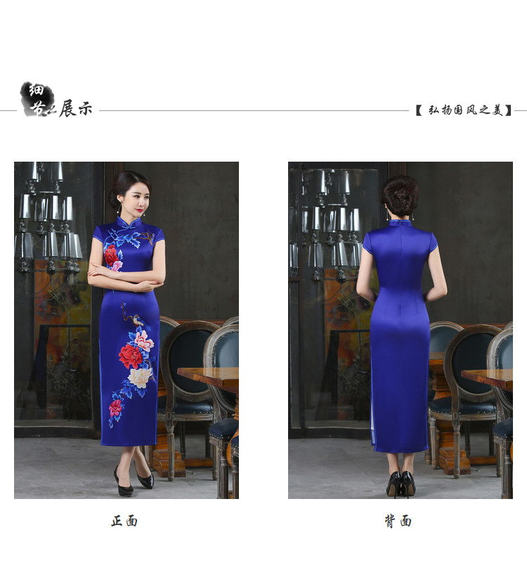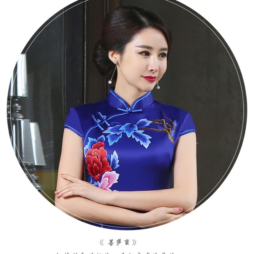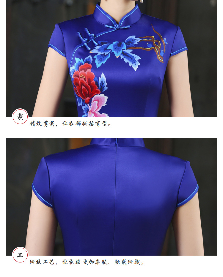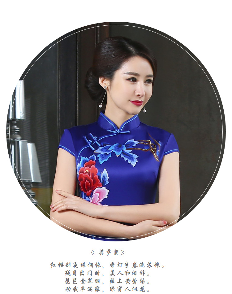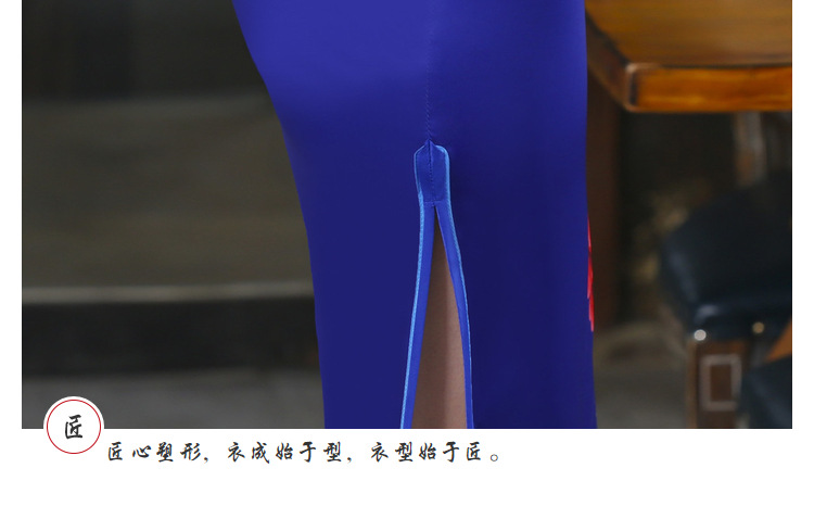 春秋季新款宽边蓝色定位款长旗袍 立领短袖中国风旗袍