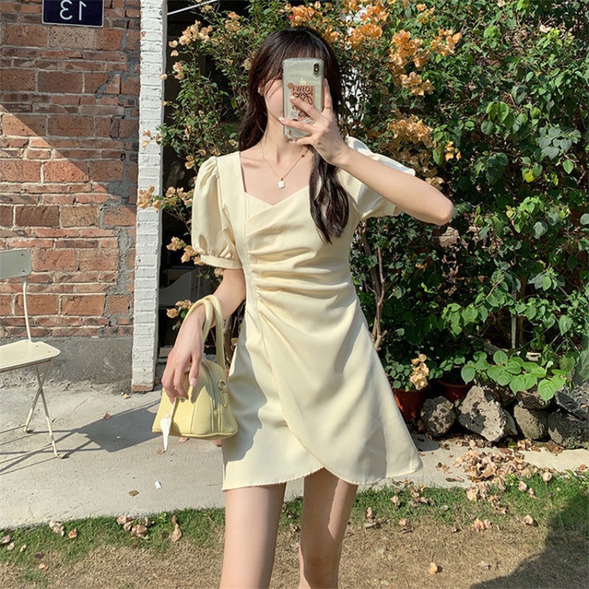 2026夏季法式方领褶皱泡泡袖不规则连衣裙女时尚收腰显瘦裙子·