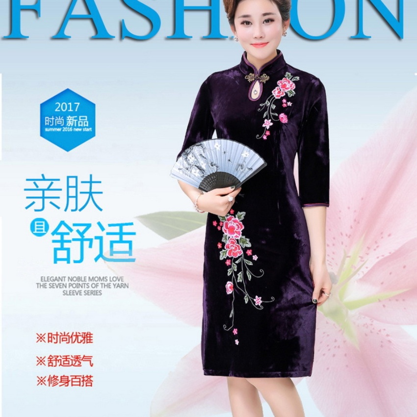 批发婚礼妈妈丝绒旗袍中长款 中老女装旗袍连衣裙七分袖绣花立领