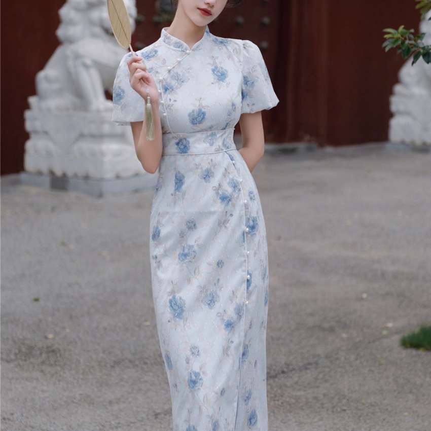 改良旗袍裙泡泡袖碎花裙子温柔气质古典风收腰新中式连衣裙女