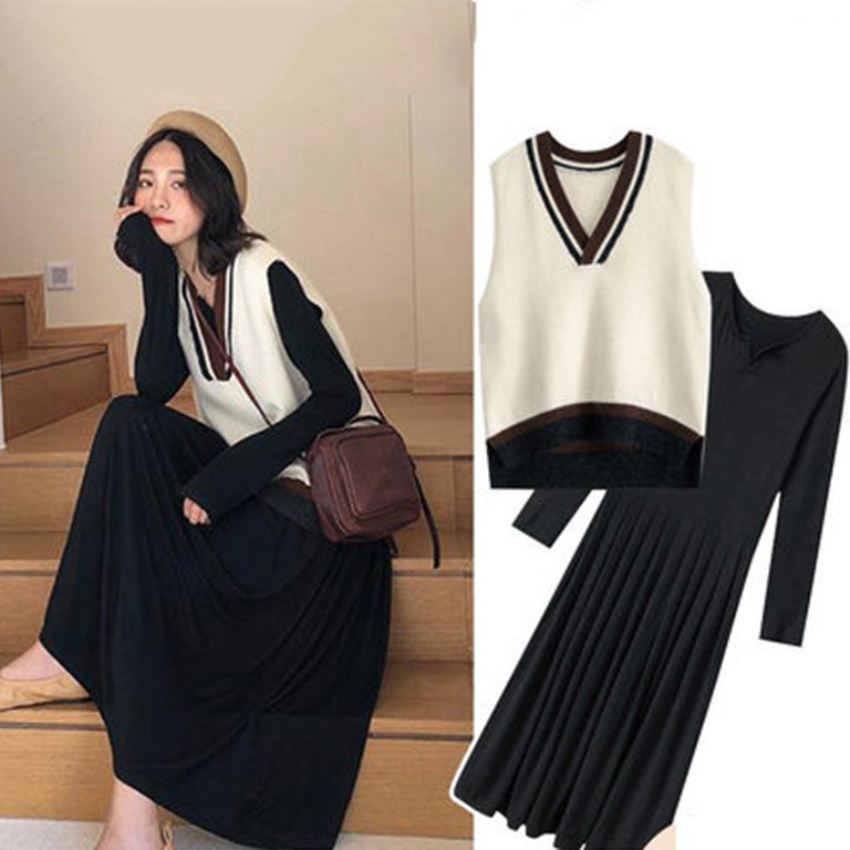 【代发 包邮】秋冬装2020年新款大码女装胖mm背带连衣裙子减龄显瘦两件套装洋气