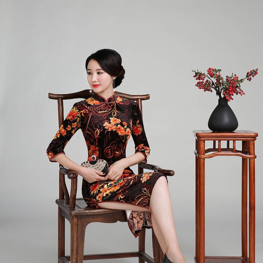 春秋款女装新款时尚金丝绒旗袍日常短款中老年大码婚宴妈妈时尚旗袍裙连衣裙