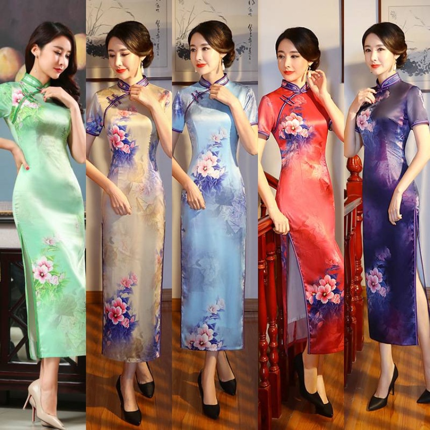 天好服饰2018新款春夏季长款定位花立领短袖走秀连衣裙宴会礼仪旗袍