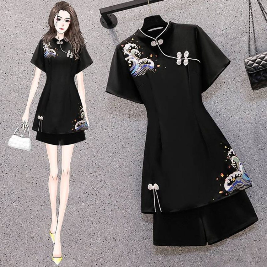 2026夏新款大码女装胖妹妹显瘦减龄中国风改良版旗袍短裤两件套装
