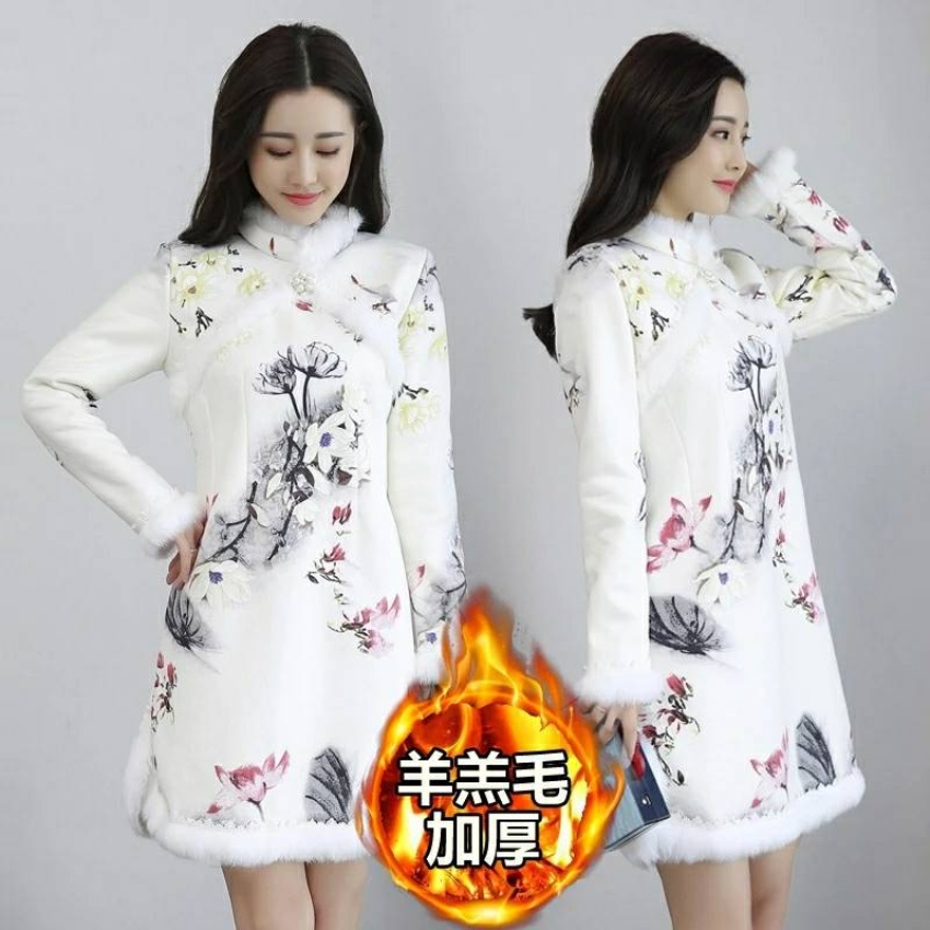 2026冬季加绒加厚兔毛保暖麂皮绒长袖短款修身少女改良旗袍连衣裙