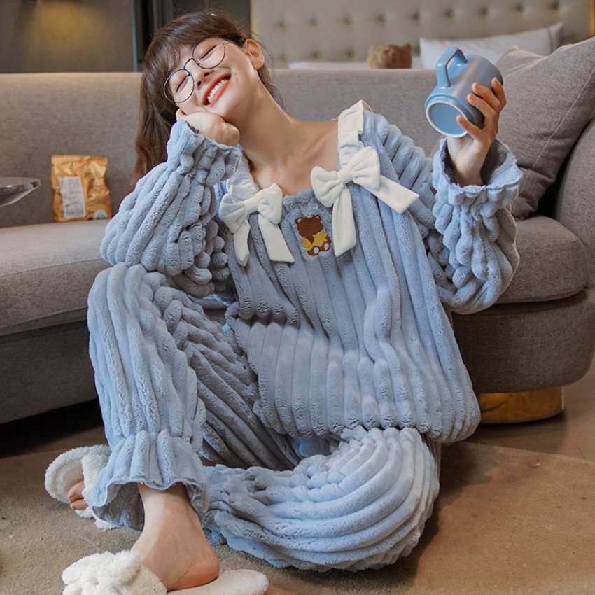 法兰绒情侣睡衣女冬季V领开衫和服秋冬款男士家居服加绒加厚保暖