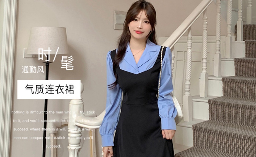 冬季撞色拼接假两件收腰系带A字裙女装2023新款设计感长袖连衣裙