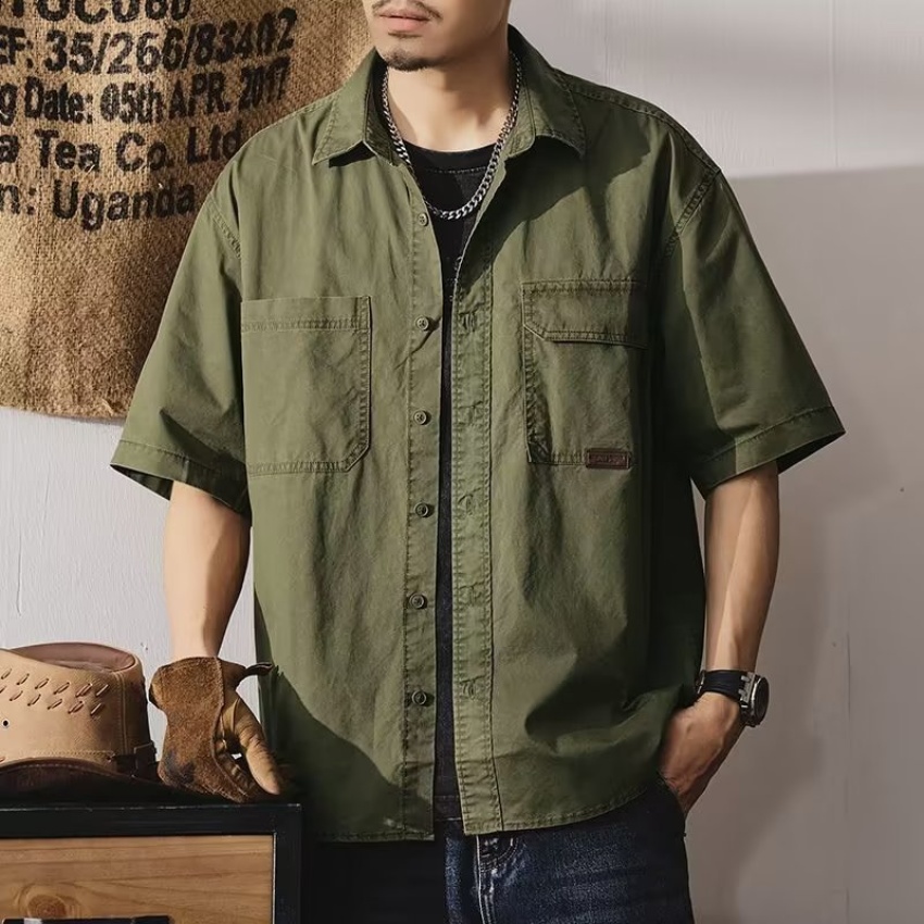 2023早秋新款复古外穿短袖衬衫男夏季潮流百搭休闲工装外套男士青少年上衣