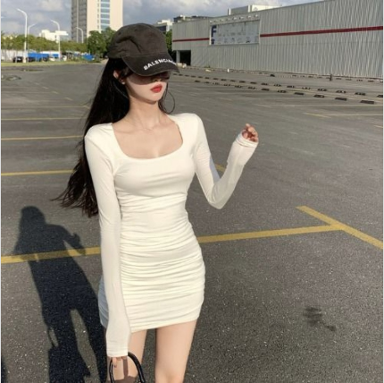 2023春秋季新款裹身包臀白色短裙法式方领紧身显瘦性感连衣裙纯色皱褶裙装