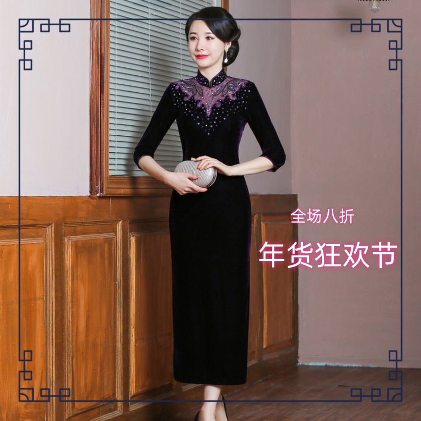 爆款秋冬款丝绒贴花贴钻长旗袍 时尚名媛风气质长旗袍
