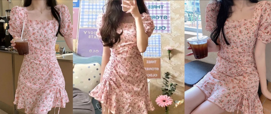 夏季碎花裙温柔风ins潮别致设计感个性艺术风裙子韩版风方领短袖连衣裙