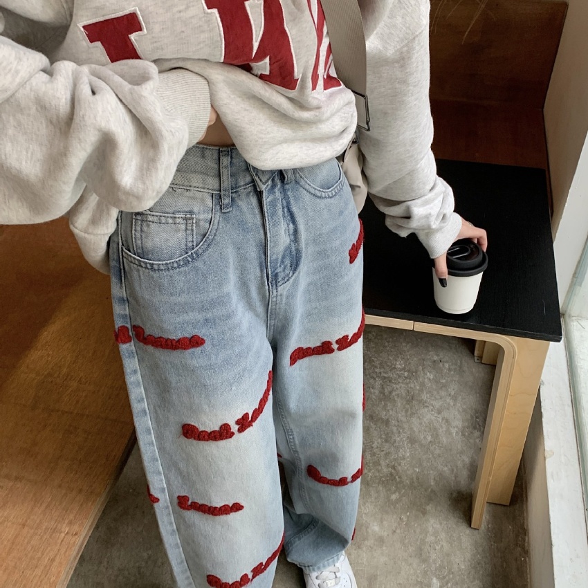 2026春秋牛仔裤红色英文刺绣绣花休闲直筒高腰显瘦裤子ins