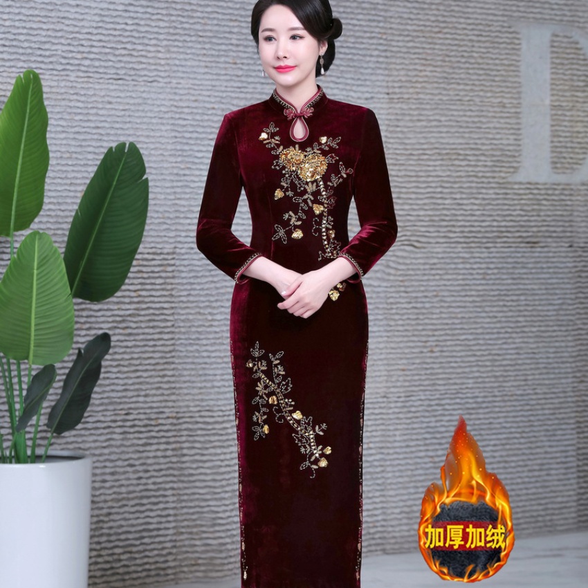 加绒加厚丝绒旗袍改良秋冬新款 复古钉珠旗袍连衣裙大码女装