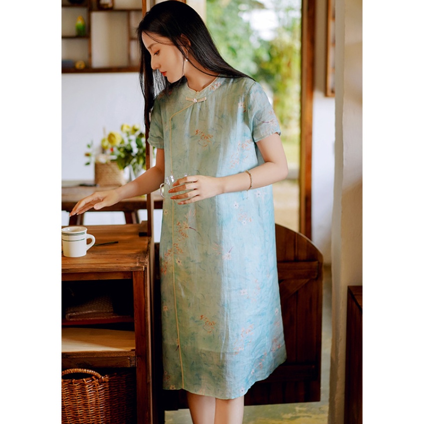 新中式棉麻女装新款2025短袖苎麻连衣裙女夏季中国风复古改良旗袍
